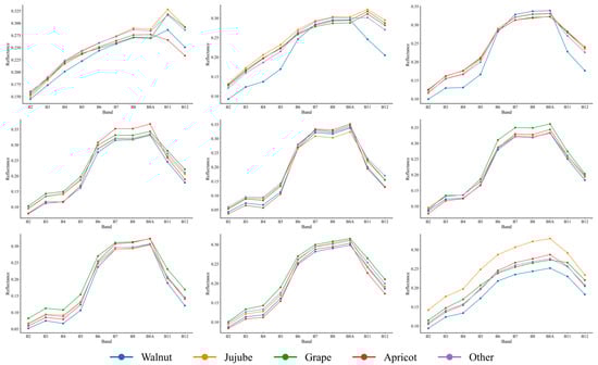 Spectral characteristics of different ground objects (representing 6 March, 8 April, 3 May, 12 June, 15 July, 29 July, 5 September, 2 October, and 30 October 2024, respectively).