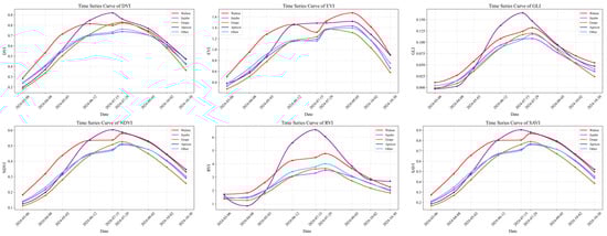 The vegetation index characteristic curve of each place (DVI, EVI, GLI, NDVI, RVI, SAVI, respectively).