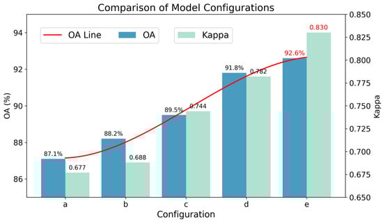 Overall accuracy (OA) and Kappa coefficients of the CF-EfficientNet ablation experiments: (a) baseline EfficientNetB0 + SGD; (b) baseline + Adam; (c) (b) + FGMF; (d) (b) + CGAR; (e) (b) + FGMF + CGAR.
