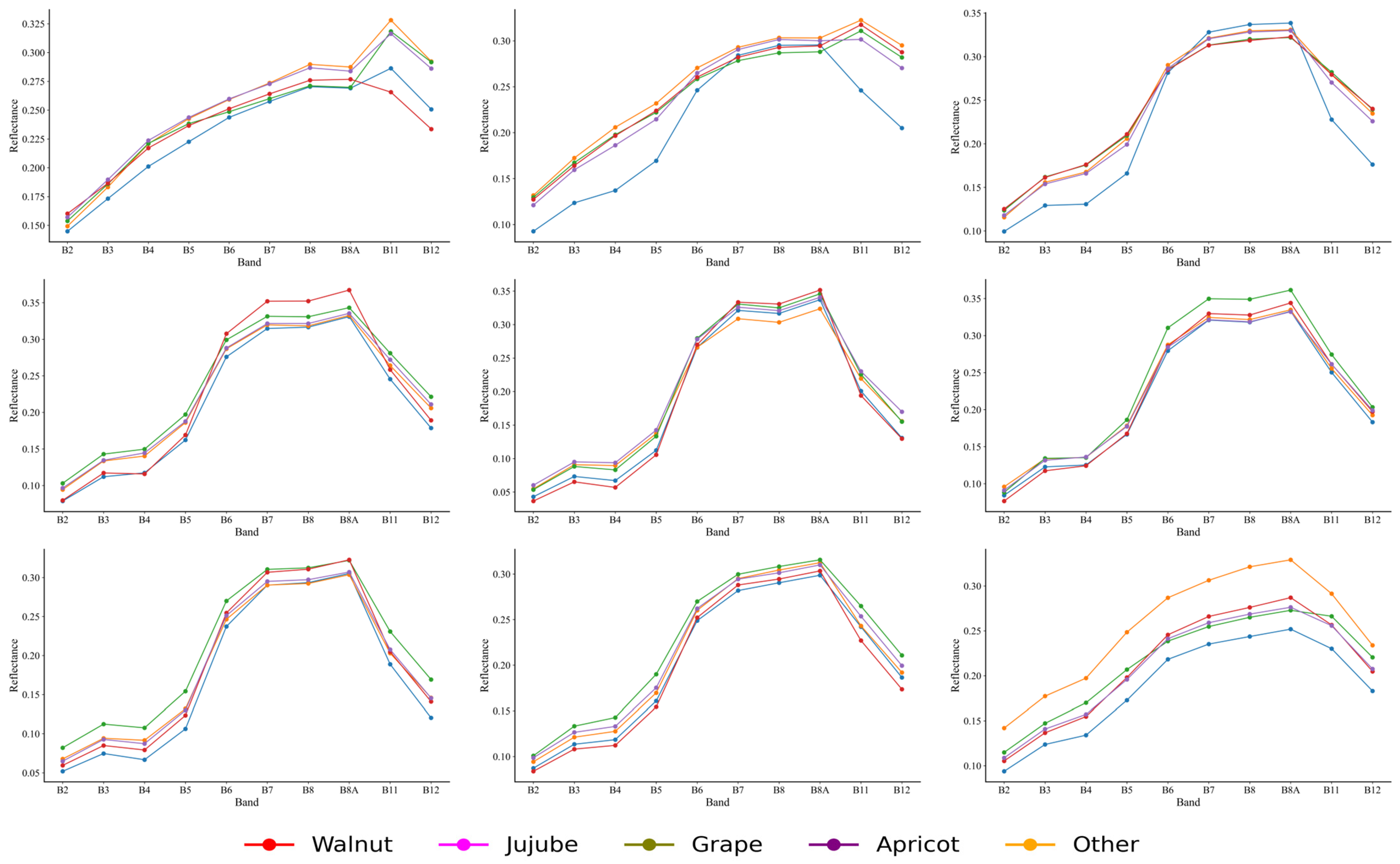 - Zhao, G.; Wang, L.; Zheng, J.; Tuerxun, N.; Han, W.; Liu, L. Optimized Extraction Method of Fruit Planting Distribution Based on Spectral and Radar Data Fusion of Key Time Phase. Remote Sens. 2023, 15, 4140. [Google Scholar] [CrossRef]