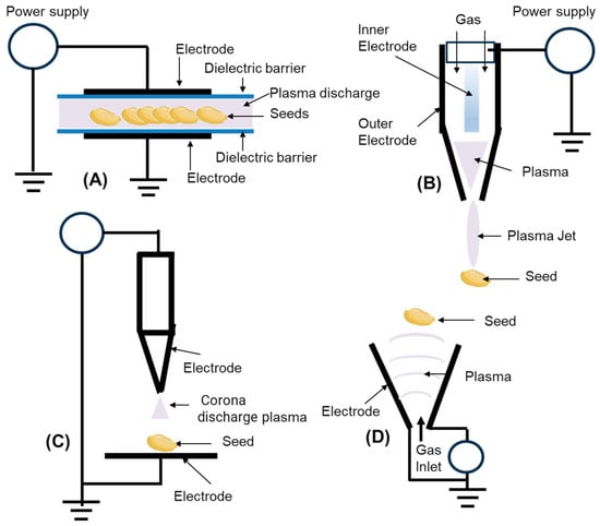 In this context, cold plasma (CP), also known as non-thermal technology, is emerging as a novel and promising tool in agricultural technology [,,,]. Plasma, often described as the fourth state of matter, is created when enough energy (in any form) is applied to a gaseous medium (air, helium, argon, etc.) []. Plasma is a partially ionized gas composed of a rich mixture of ions, electrons, free radicals, excited atoms, and molecules, as well as UV radiation [,]. It is generated under atmospheric pressure conditions using low-energy electrical discharges and it operates at near-room temperatures, making it suitable for various agricultural applications []. The application of CP to plant materials, particularly seeds, is a non-thermal, water-less, and chemical-free process that has demonstrated a remarkable ability to modify seed properties and stimulate plant growth []. It is routinely generated via dielectric barrier discharge, plasma jets, corona discharge, RF-driven micro-hollow cathode discharges, gliding arc, and microwave sources [,,].
