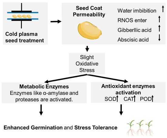Beyond the physical changes to the seed coat, CP induces a cascade of deep biochemical and physiological responses within the seed itself. The biochemical and physiological reactions triggered by the plasma treatment in seeds are summarized in Figure 2. This is primarily mediated by the diffusion of smaller, relatively stable reactive oxygen and nitrogen species (RONS) through the newly permeable seed coat [,,,]. Once entering, these species act as effective signaling molecules, like their role in native biological systems. The nitric oxide (NO), a key RNS component of CP, is a well-known signaling molecule in plants that can break seed dormancy by interacting with phytohormone pathways [] and enhances seed germination. It is widely reported that plasma treatment alters the crucial balance between the growth-promoting hormone gibberellic acid (GA) and the dormancy-inducing hormone abscisic acid (ABA), creating a higher GA/ABA ratio that highly promotes germination []. Also, the influx of RONS introduces a slight oxidative stress. This prompts the seed to upregulate its endogenous antioxidant defense systems, leading to an increase in the activity of enzymes like superoxide dismutase (SOD), catalase (CAT), and peroxidase (POD) []. This response not only mitigates potential damage from the plasma itself but may also boost the seed, making the obtained seedlings more resilient to environmental stresses. Finally, the enhanced water uptake activates metabolic enzymes, such as α-amylase and proteases, which are responsible for breaking down stored starches and proteins into usable energy for the growing embryo [].