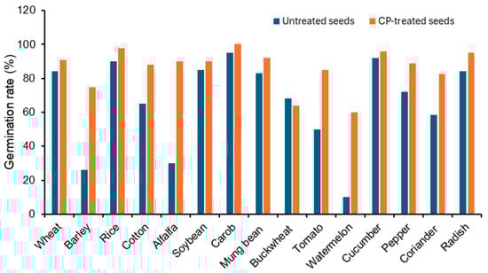 Effects of cold plasma (CP) seed treatment on germination rate (%) across 15 plant species based on previously published studies. For each species, the optimum exposure time reported in the respective study was selected to redraw the figure. Values reflect data compiled from the literature, and in all studies, the observed differences between untreated and CP-treated seeds were statistically significant (p < 0.05). Buckwheat represents the only exception, where CP treatment (radio frequency plasma for 40 s) resulted in a slight decrease compared with the untreated seeds. The species are wheat [], barley [], rice [], alfalfa [], soybean [], carob [], mung bean [], buckwheat [], tomato [], watermelon [], cucumber [], pepper [], coriander [], radish [], andcotton [].