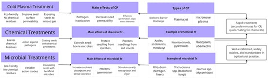 Diagram of comparison between cold plasma, chemical, and microbial seed treatments.