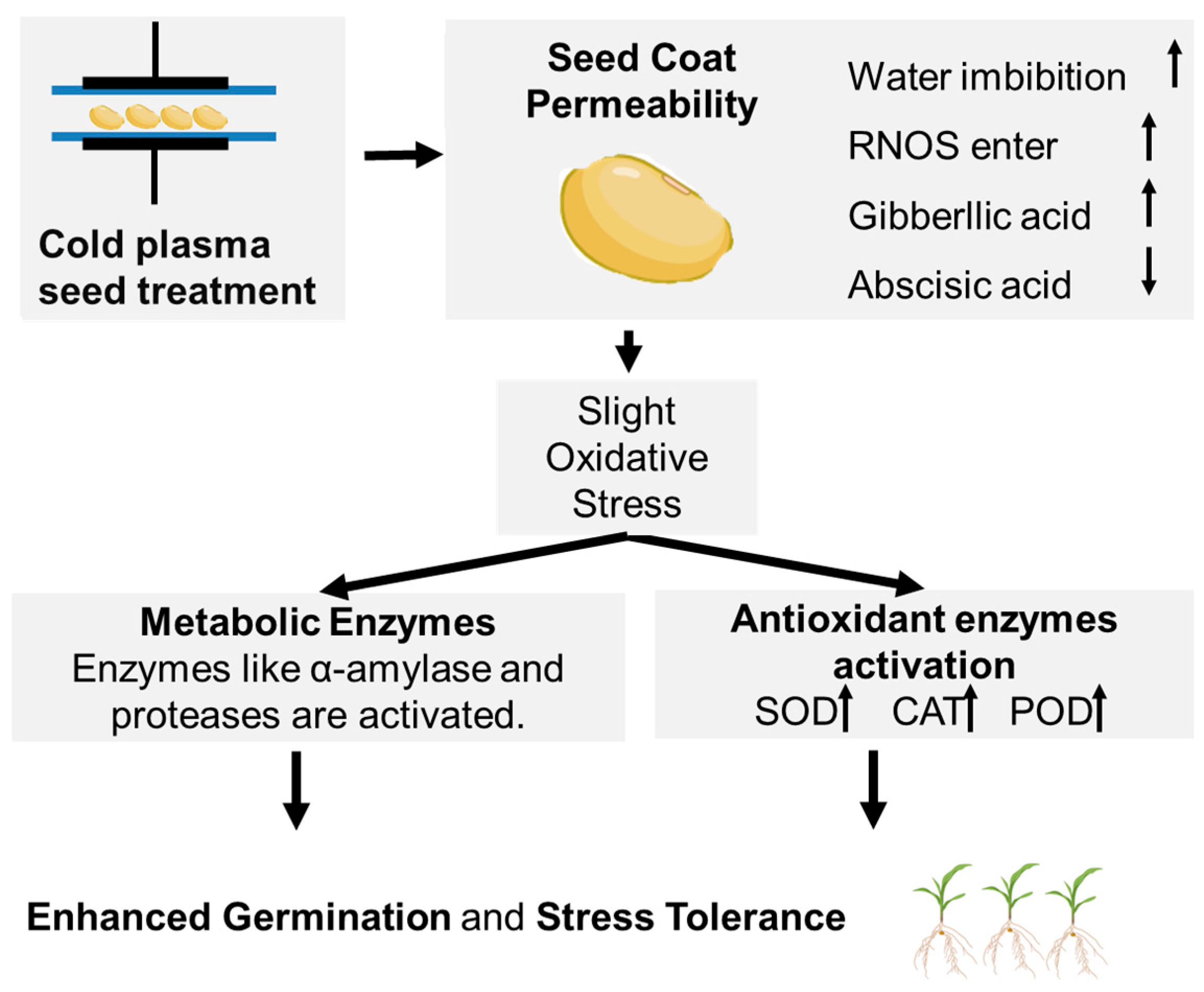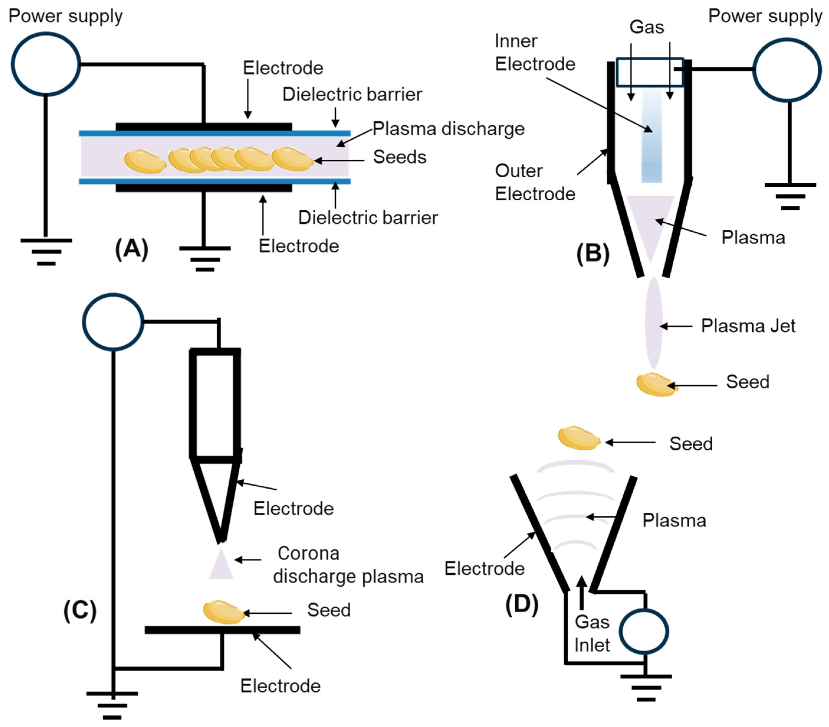 - Excessive or prolonged plasma exposure can damage seed surfaces and even internal structures, reducing seed viability and growth. A recent study demonstrated that plasma treatments beyond an optimal duration caused cracking and rupturing of seed coats, negatively affecting water uptake and the development of seedling. For soybean, cultivar-specific responses further illustrate the risks of excessive plasma exposure. According to the study by [84], significant variation was observed among cultivars: some showed enhanced germination and vigor at shorter exposure times (≤3 min), while others demonstrated declines in germination percentage, seedling length, and vigor index when treated for longer durations (≥5 min) or under higher discharge power. In addition, prolonged exposure was associated with altered antioxidant enzyme activities, indicating stress responses [84]. These findings emphasize that optimization of CP treatment is strongly cultivar-dependent, and that exceeding threshold exposure levels can shift effects from beneficial to detrimental.