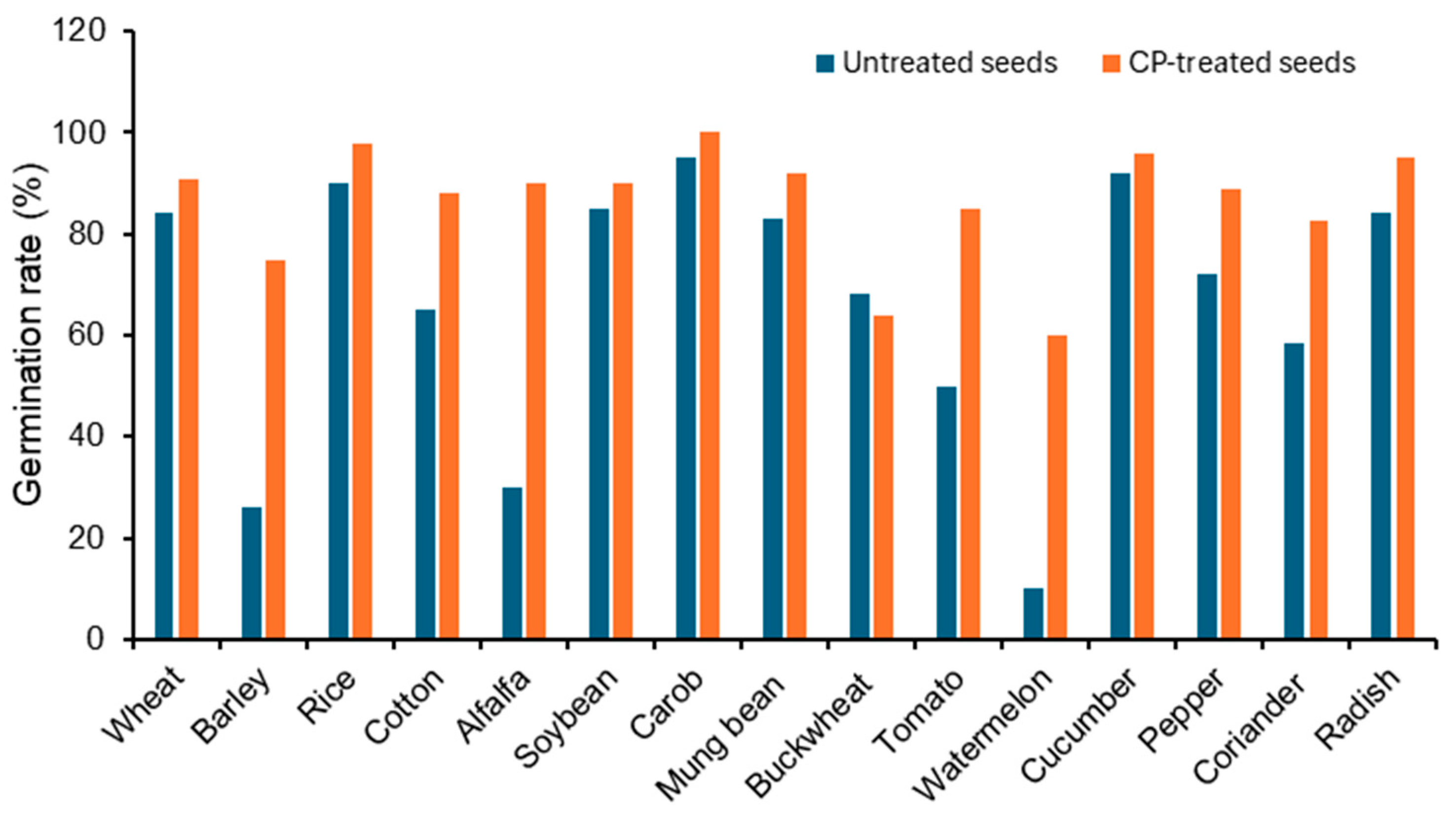 - While CP treatment enhances early seedling vigor, these advantages may diminish over time. Some studies show faster germination and enhanced early seedling growth, treated and untreated plants reach comparable final growth and biomass at later stages [91]. This suggests that the positive effects of CP are often limited to early developmental stages, highlighting the need for long-term monitoring to determine whether initial benefits translate into lasting agronomic improvements.