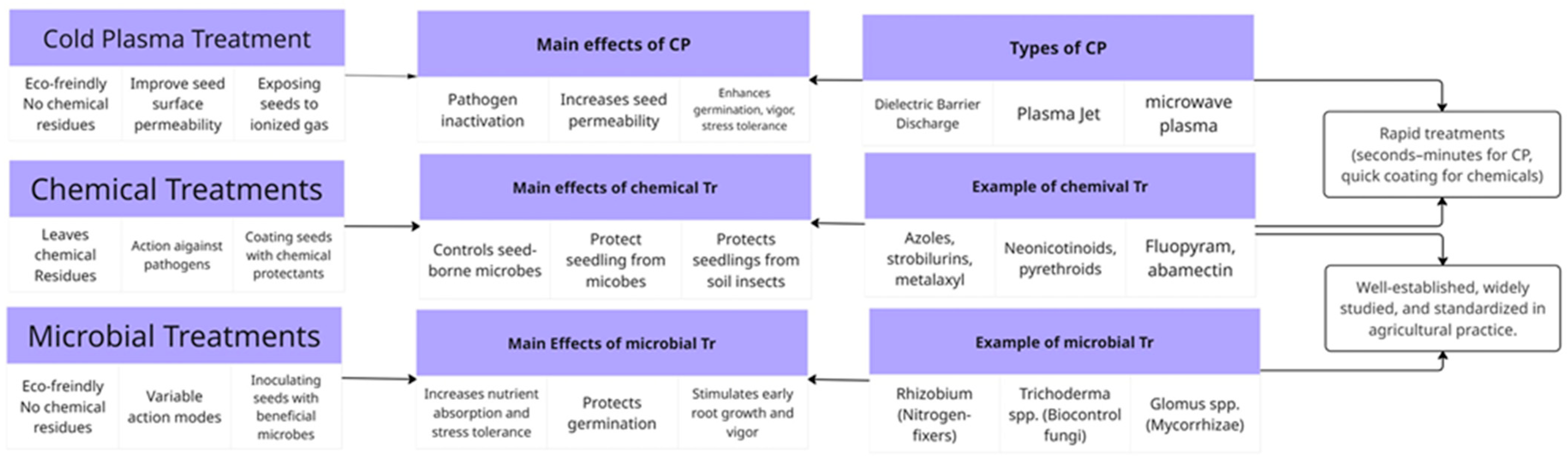 - Practical challenges limit field adoption, as farmers are familiar with chemical or microbial seed treatments; CP requires new infrastructure and training. The challenges of practical field application include the need of specialized, often costly equipment and technical expertise to operate plasma treatment systems effectively [86]. Limited field-scale data and standardized protocols further complicate widespread acceptance in agricultural practice [71,83].