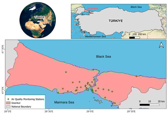 Istanbul is Türkiye’s most populous metropolitan city, with a population of approximately 16 million. Its role as a bridge connecting Asia and Europe has made it a major transportation, industrial, and tourism hub (Figure 1). Due to internal migration and increasing population, residential areas have increased significantly in the last 30 years to meet the city’s housing needs [30,31], and it is estimated that they will increase further [32]. Therefore, monitoring air quality in cities with intense human activity is gaining importance. To this end, the Istanbul Metropolitan Municipality and the Ministry of Environment, Urbanization, and Climate Change have established air quality monitoring stations in the city. The distribution of air quality monitoring stations is shown in Figure 1.