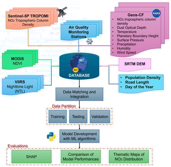Within the scope of this study, ground-level NO2 concentrations in Istanbul were estimated using ML algorithms by integrating ground-based air quality monitoring data with satellite-derived tropospheric column of NO2, including Sentinel-5P TROPOMI and Geos-CF datasets. Three machine learning algorithms were applied to a dataset spanning 2019–2024 at a spatial resolution of ~1 km, with a focus on seasonal variations. Both qualitative and quantitative evaluations were conducted. To improve prediction accuracy, a comprehensive set of topographic, meteorological, environmental, and demographic variables was incorporated. Model interpretability was ensured using SHAP, a widely adopted explainable AI method [29], to identify the most influential features of NO2 variability. The study will address the following research questions: