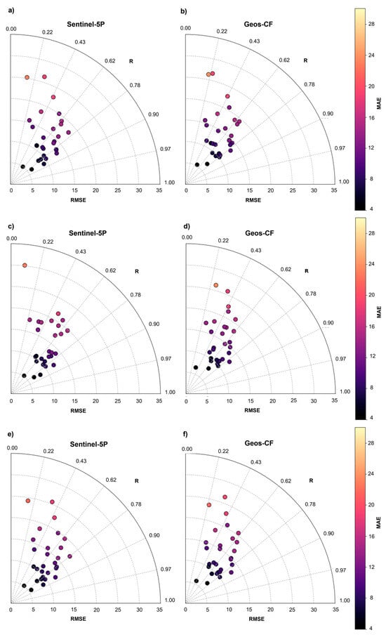 The station-based diagrams, including accuracy metrics (RMSE, MAE, and R) for all algorithms, are presented in Figure 4. In general, the RF model (Figure 4a,b) and CB model (Figure 4e,f) exhibited similar performance for the Sentinel-5P dataset, characterized by high correlation coefficients (R > 0.7) and relatively low RMSE (mostly below 15 µg/m3). The color distribution further indicates lower MAE values, suggesting that RF and CB achieved more stable and accurate estimations across different stations. The XGB model (Figure 4c,d) showed a wider spread of RMSE values, with several points extending toward higher error levels, reflecting greater variability in prediction accuracy. The CB model (Figure 4e,f) demonstrated consistent and balanced results, with moderate RMSE and relatively high correlation values similar to those of RF. Across all models, the Sentinel-5P-based results (Figure 4b,d,f) generally outperform those derived from Geos-CF (Figure 4a,c,e), indicating a better agreement between Sentinel-5P observations and the model outputs. Overall, the station-based analysis confirms that RF and CB provided the most robust and reliable predictions, while Sentinel-5P data provided stronger consistency with the modeled variables. Additionally, the analysis revealed that the models consistently exhibit high errors at the same stations. The three stations with the highest errors exceeding 20 µg/m3 (Avcılar, Ümraniye2, and Esenler) are located in spatially distinct areas within the most densely populated districts. This may be attributed to abrupt fluctuations in measured values, which could have increased the model errors at these stations.