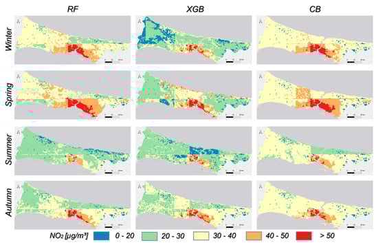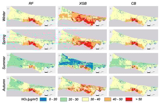 According to Figure 5, seasonal maps obtained from the XGB model are quite noisy, unlike those from other models. It was observed that the amount of NO2 was high in the northern parts of the city where forested areas were dense. Seasonal variation in NO2 distribution shows significant changes in both the RF and CB models. During winter and spring, NO2 levels are higher in the southern parts of the Bosphorus, where urban areas are dense, while they are lower in other areas. While NO2 levels decrease in the summer months, they increase again in the autumn. Differences between the two model results are particularly evident in summer and autumn. The sharp linear changes in the results are due to the pixel sizes of the Geos-CF data.