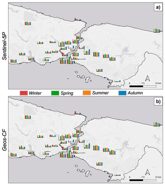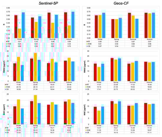 When the Sentinel-5P and Geos-CF model results are compared, it is observed that the RF and CB model results shown in Figure 5 and Figure 6 mostly yield similar results. In the quantitative evaluation, it was determined that the CB model created with Sentinel-5P data showed better results than the models established with Geos-CF in both the training, validation, and testing stages (Table 2) and in the seasonal evaluation analyses (Figure 7).