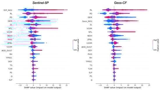 To investigate the impacts of features on the estimation of ground-level NO2, SHAP analysis was performed for each data model. The results are presented in Figure 9, and the 20 features are listed in order of importance. While Sentinel-5P NO2 data became prominent as the most important factor, Geos-CF data contributed to the model as the fourth most important factor. This reveals that location features (RL, PD, and DEM) are more important than Geos-CF data. It also demonstrated the necessity of including satellite-derived NO2 data in the ground-level NO2 estimation model [58].