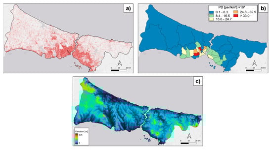 DEM was identified as the third most important factor after RL and PD, and its distribution in Istanbul is given in Figure 10c. According to the SHAP results, decreasing elevation causes an increase in ground-level NO2. The reason for this can be the high settlement and human population on the shores of the Bosphorus, where the elevation is low. When Figure 10 is examined, in areas with high elevation, both the road network and population density decrease, and therefore the NO2 level also decreases.