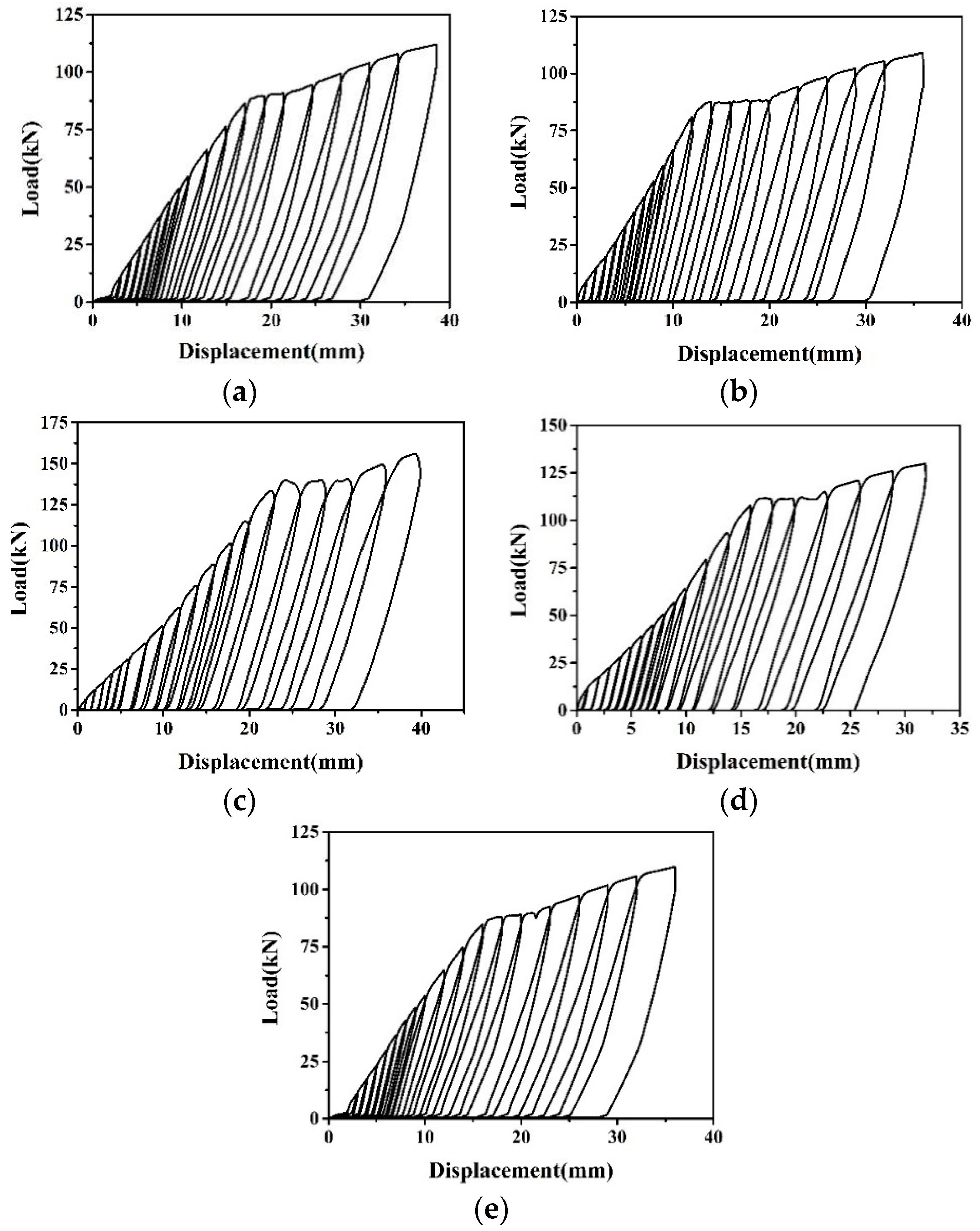(3) The yield platform elongation was adopted as the ductility index. The decrease in unbonded length or the increase in rebar diameter or strength reduced the ductility of the specimen, and the increase in unbonded length improved the energy dissipation capacity of the specimen. The influence of rebar diameter on energy dissipation capacity is larger than that of rebar strength. The concrete strength had little influence on the ductility and energy dissipation capacity of the specimen.