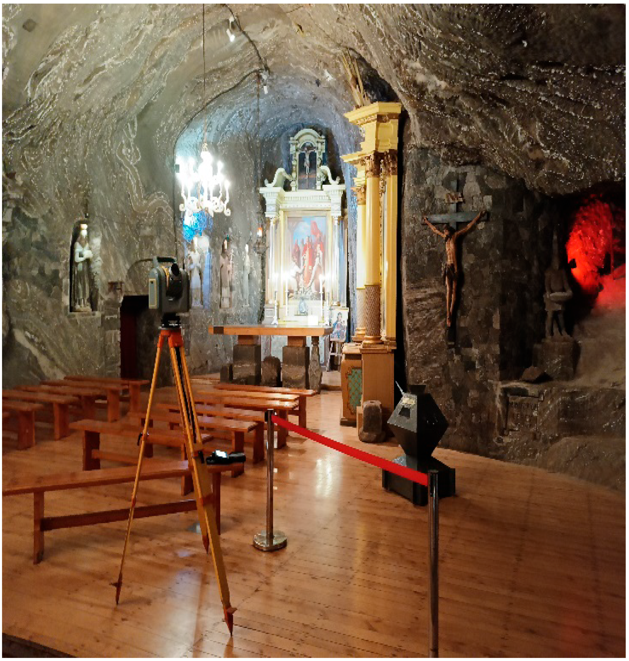 Figure 4). Measurements taken from different locations are combined and transformed in specialized cloud-based programs. A three-dimensional point cloud is the result of laser scanning and is often considered a full commercial product in the form of a point model. This point model of St. Kinga Chapel at the Bochnia Salt Mine was obtained by the authors using a precise Trimble SX 10 scanning total station (Trimble Inc., Sunnyvale, CA, USA) (