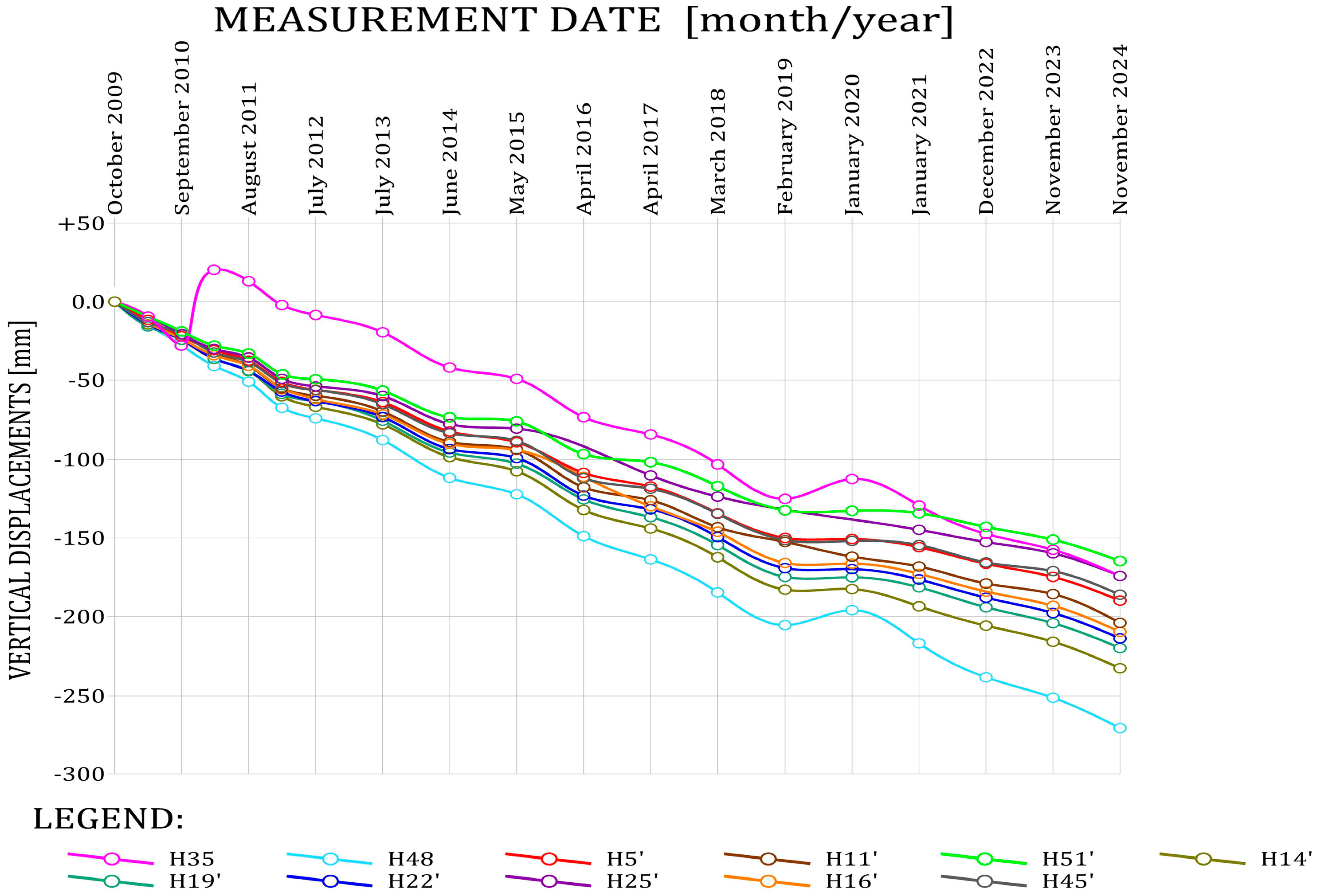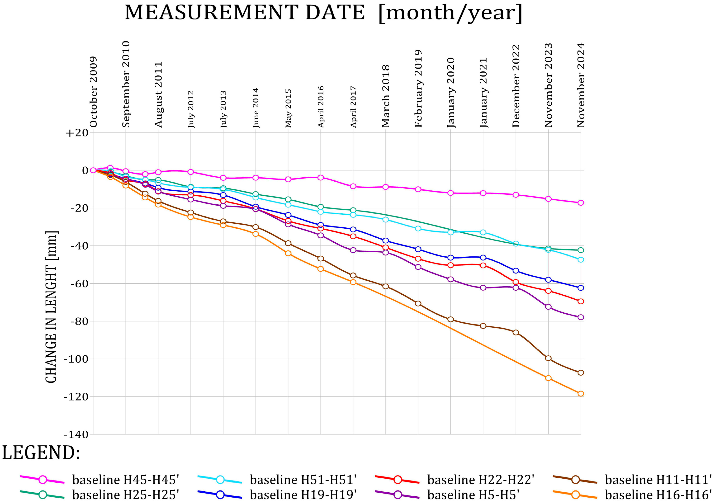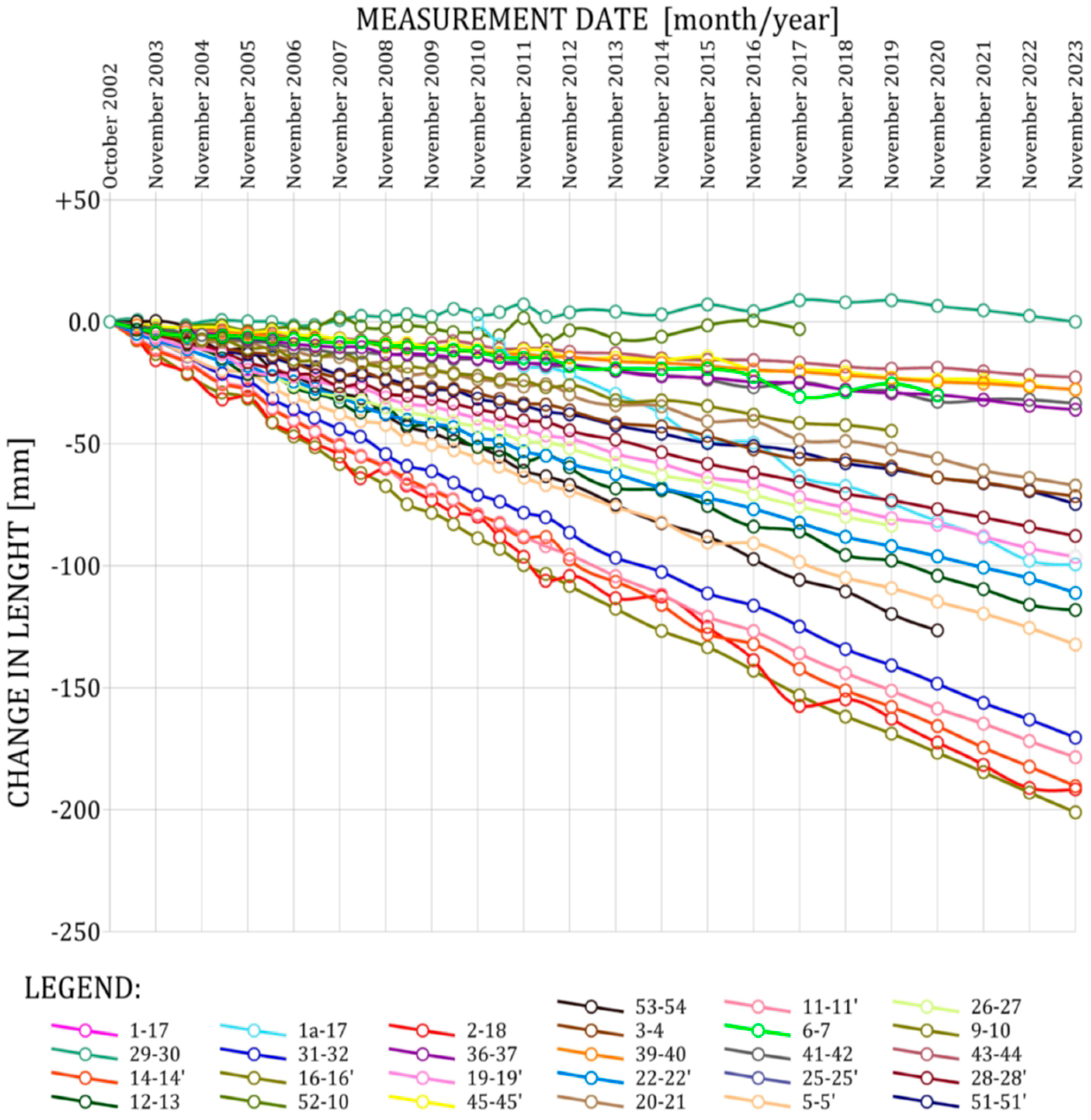 The above analysis shows that the error value is an order of magnitude smaller than the annual changes in vertical displacements and has no impact on the trend values presented below. The same is true for horizontal convergence measurements, but the annual convergence values are smaller than those for vertical convergence. More valuable information on the measurements can be found in [