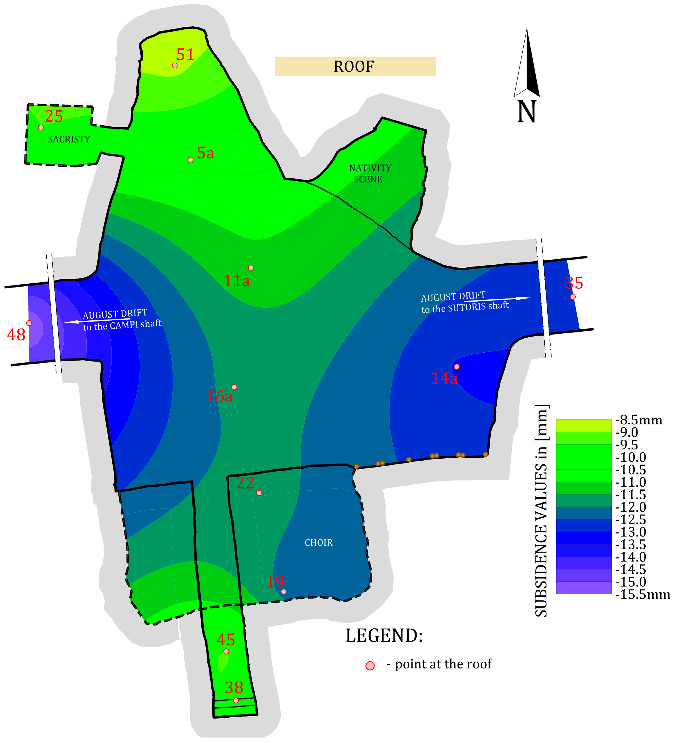 The Saint Kinga Chapel. The annual vertical displacements of the chamber’s roof (the upper map) and floor (the lower map).