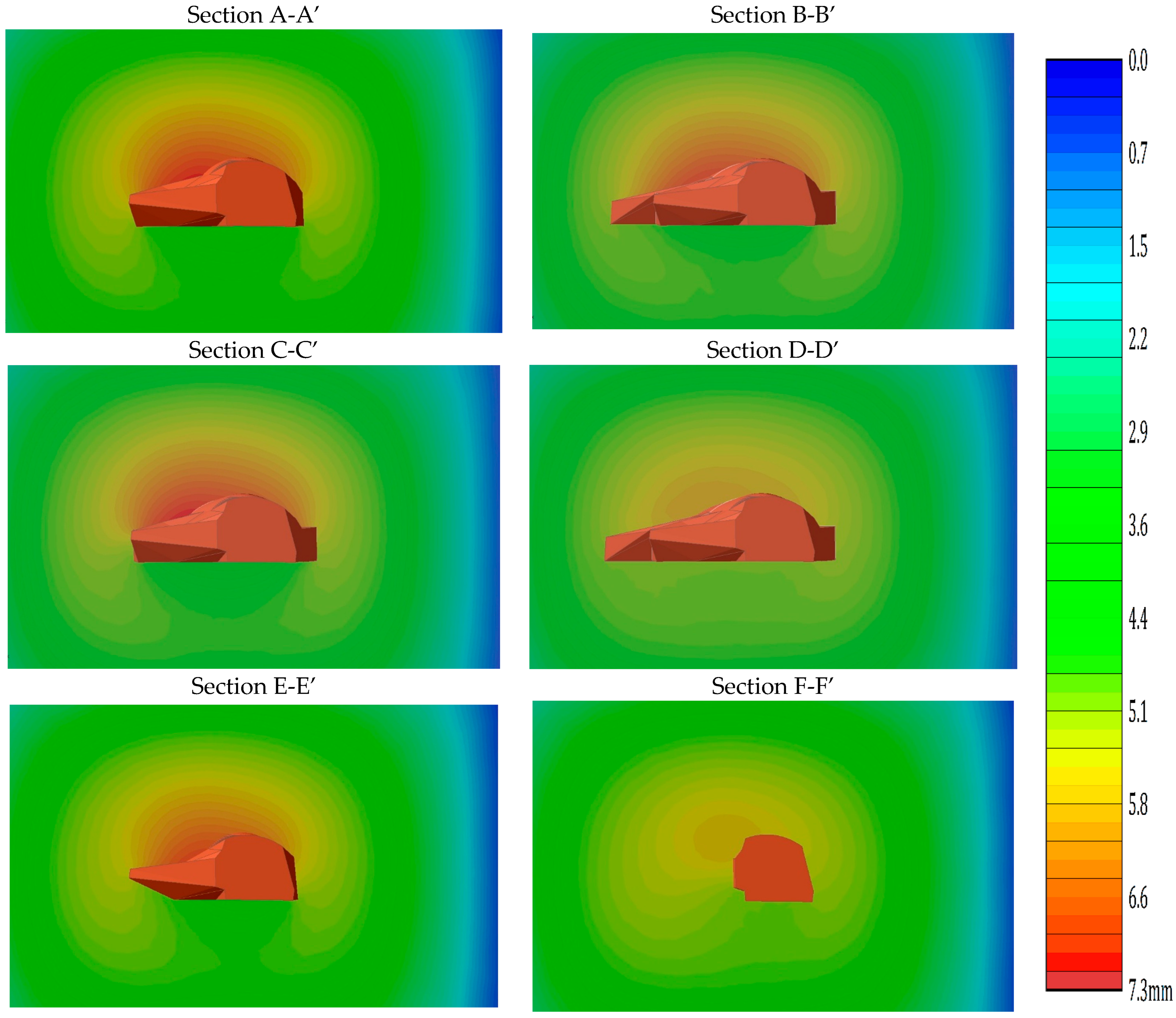 19]. To date, there are no measurements of the absolute values of the horizontal displacements of points made with satisfactory accuracy, which would allow for determining the detailed characteristics of the displacement of individual sidewalls. The situation is different in the case of vertical convergence. Here, it is known that the vertical displacements of the roof are greater than the floor subsidence, and it is this which is the cause of the vertical convergence of the workings.