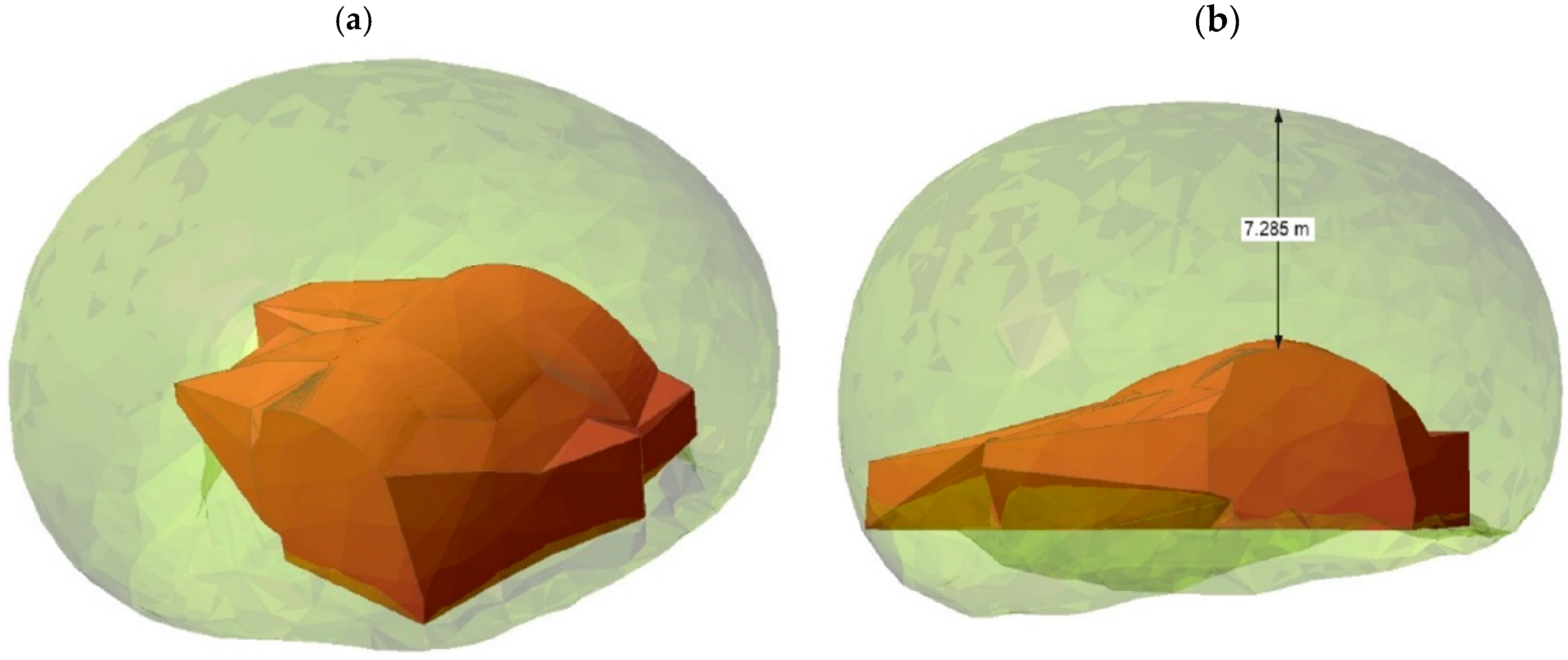Total displacements with an isosurface of 7 mm: (a) 3D view, (b) cross section.