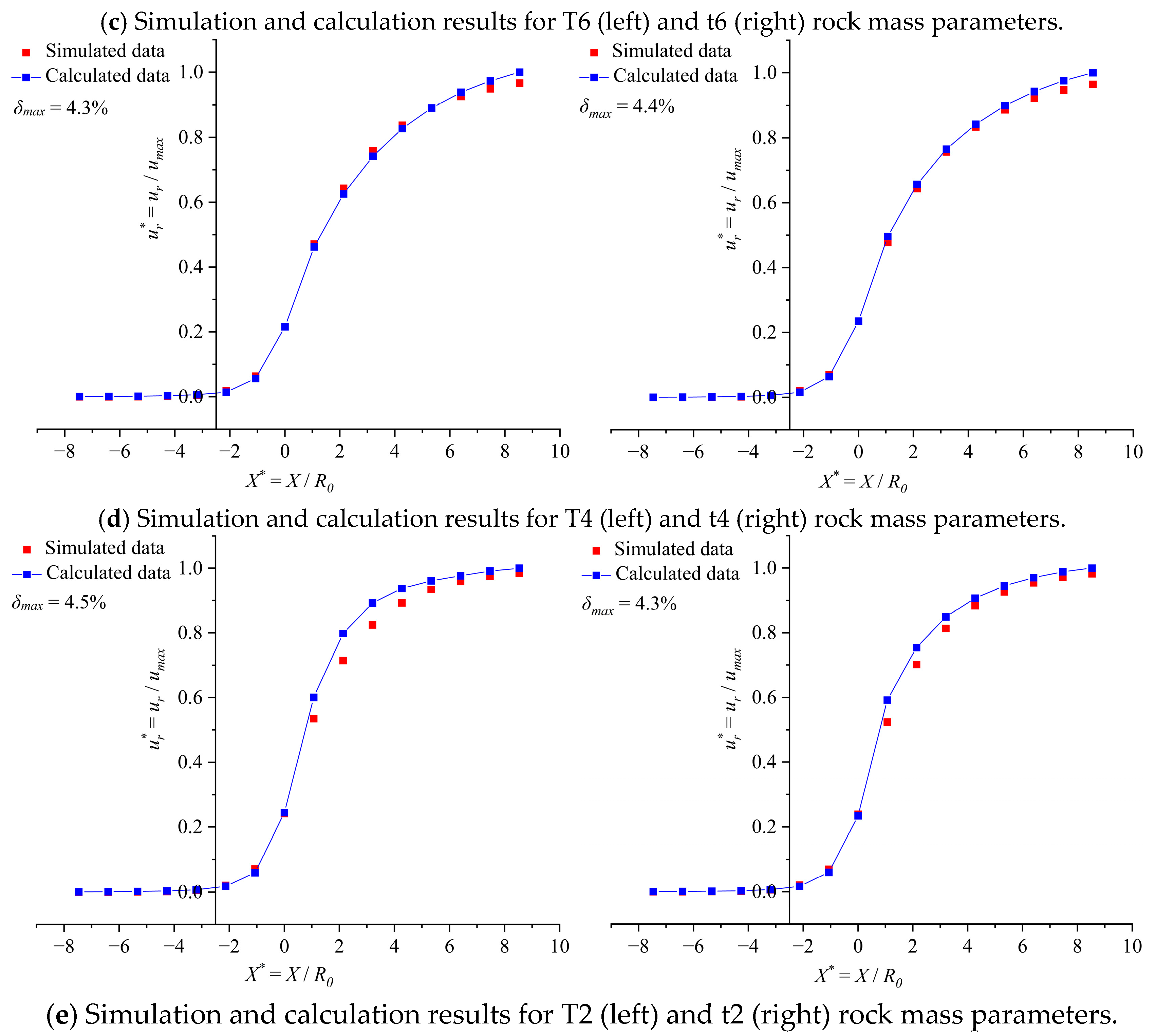 Figure 4 shows high consistency between the LDPs of the tunnel-surrounding rock assigned different parameter groups and constructed using the two methods, which preliminarily verifies the accuracy of the proposed analytical expressions for constructing the LDP of the elastic–brittle–plastic tunnel-surrounding rock.