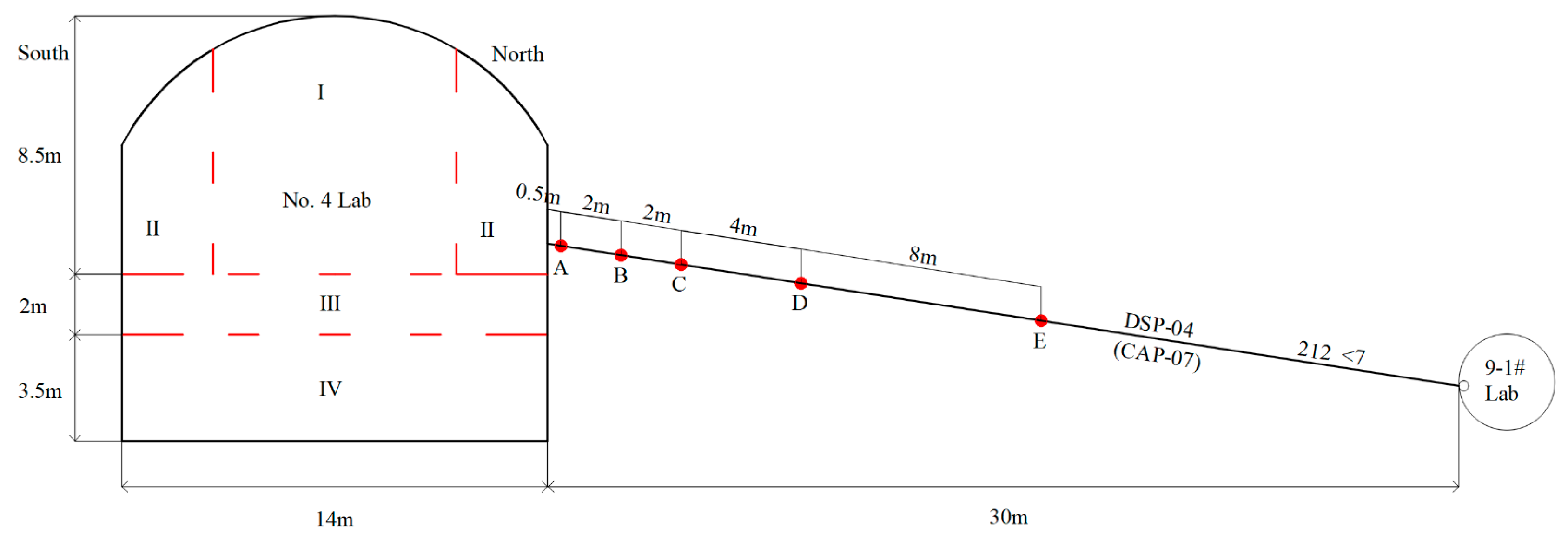 Figure 5. The No. 4 experimental tunnel is excavated in layers in the order of I, II, III, and IV. The measurement point positions of the multi-point displacement meter are indicated by A, B, C, D, and E in