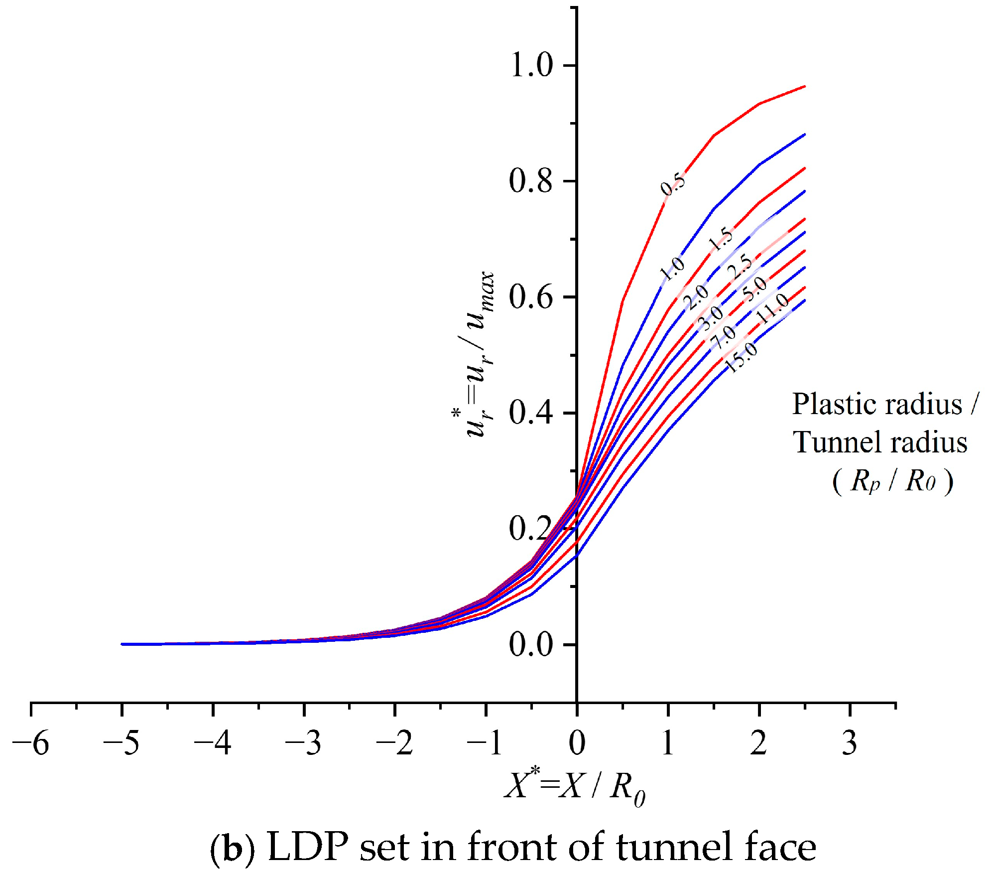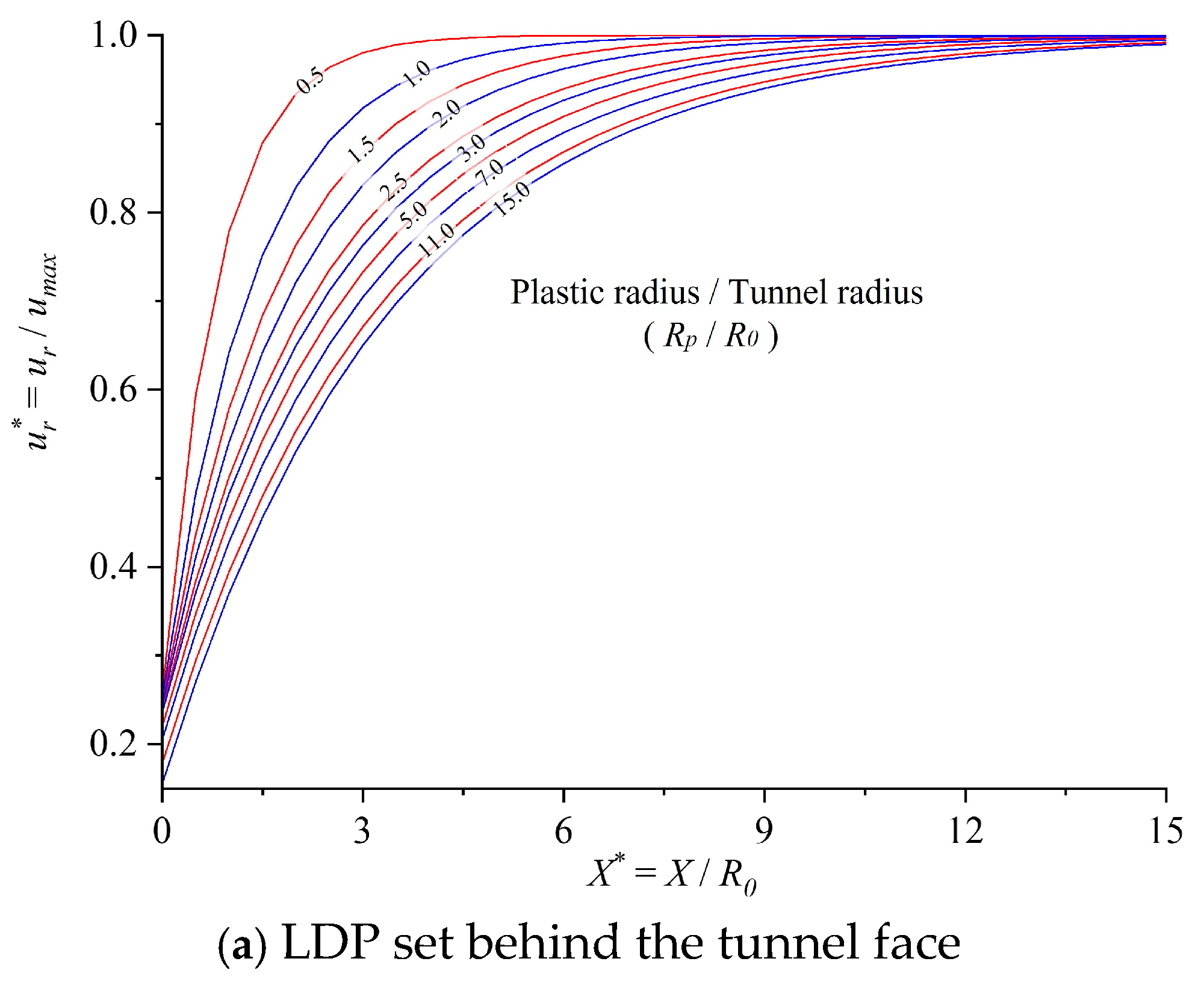 11] posited that the radius of the plastic zone has a significant impact on the tunnel’s LDP. They used the elastic–perfectly plastic model, through numerical simulation and obtained LDP expressions considering the influence of the plastic zone: