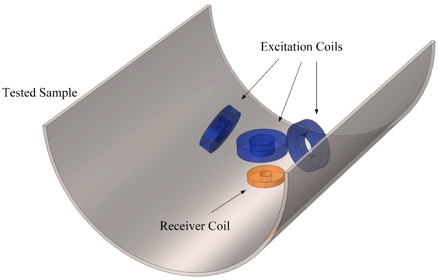 - Zou, X.; She, S.; Zheng, X.; Yu, K.; Shen, J.; Peyton, A.; Yin, W. Simultaneous Estimation of Conductivity and Radial Eccentricity of Metallic Cylinders Using Eddy Current Testing. IEEE Trans. Instrum. Meas. 2025, 74, 6011110. [Google Scholar] [CrossRef]