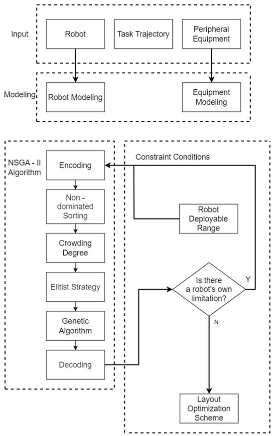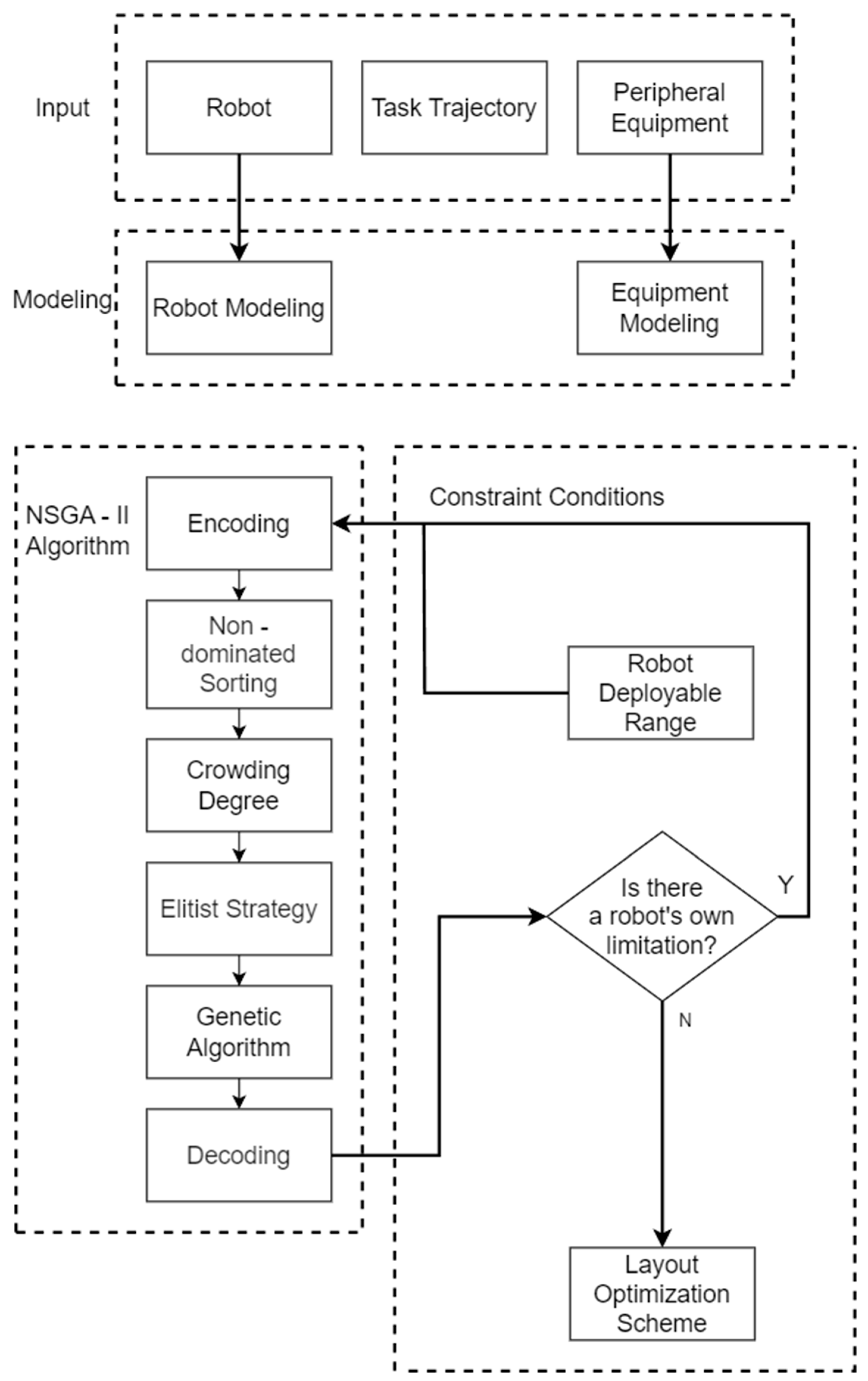 The structure of the robot encapsulation production line layout optimization algorithm based on the NSGA-II algorithm is shown in