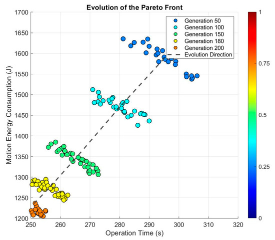 Figure 5 reveals that the Pareto front gradually shifts toward the lower-left region, indicating that the proposed optimization model—which simultaneously considers operation time and energy consumption—and the tailored algorithmic framework are effective.