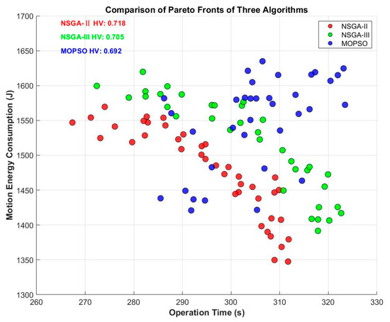 To verify the effectiveness of the NSGA-II algorithm in solving the proposed problem, comparative experiments were conducted against two other classical multi-objective optimization algorithms—NSGA-III (designed for high-dimensional objective spaces) and MOPSO (multi-objective particle swarm optimization).
