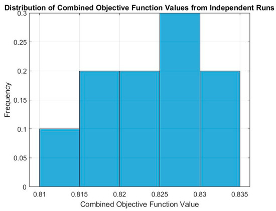 Figure 7 illustrates the distribution of the best composite objective values obtained in each run, while
