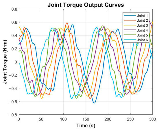 Figure 11 illustrates that the joint torque outputs remain within allowable limits and exhibit smooth variations without abrupt fluctuations, which is beneficial for reducing both energy consumption and mechanical wear.
