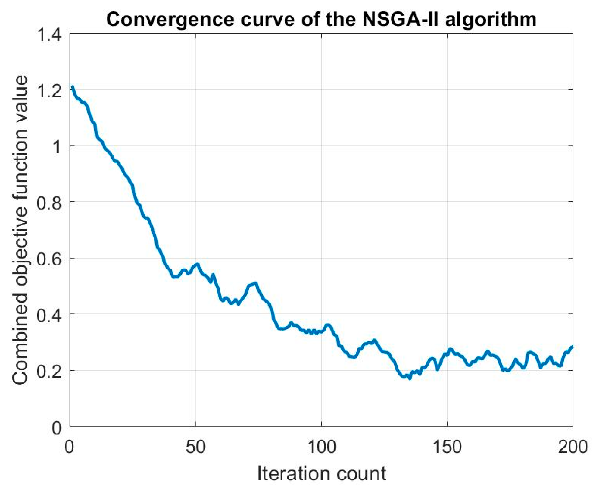 Figure 4 illustrates the convergence process of the NSGA-II algorithm during a representative run, where the horizontal axis denotes the number of generations and the vertical axis represents the composite objective function value (weighted sum with weights