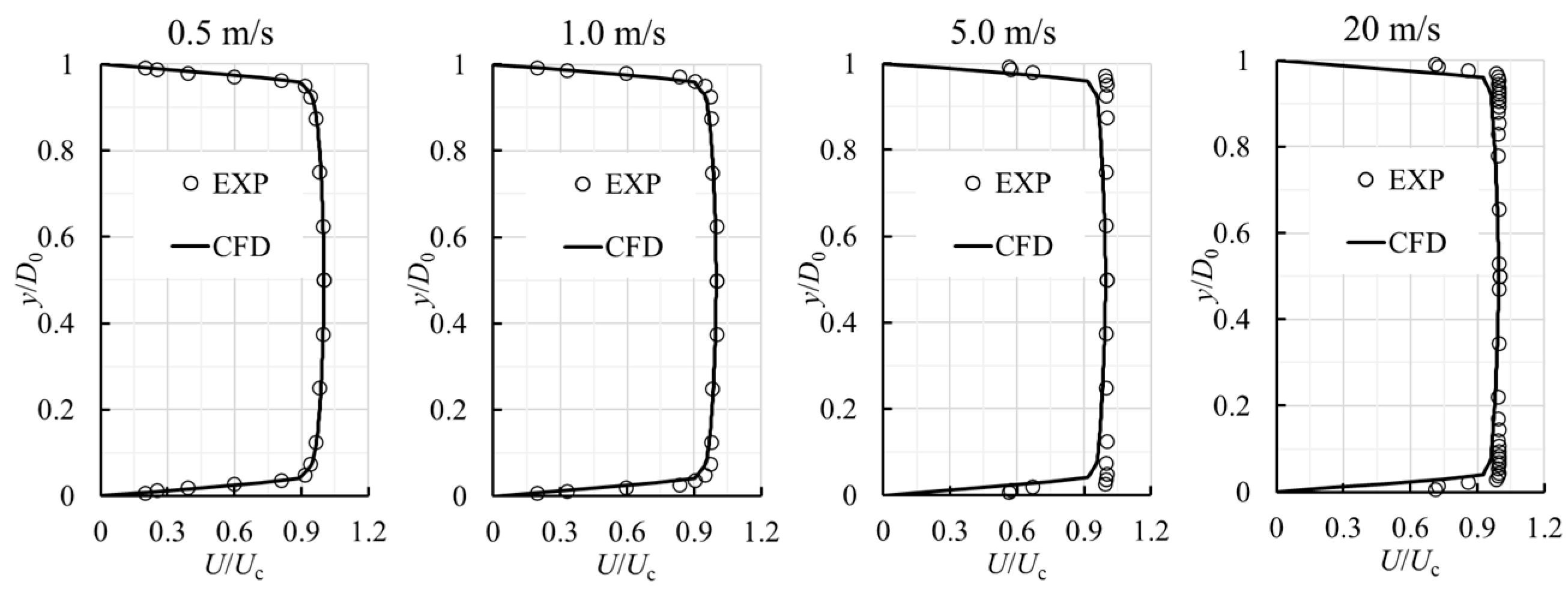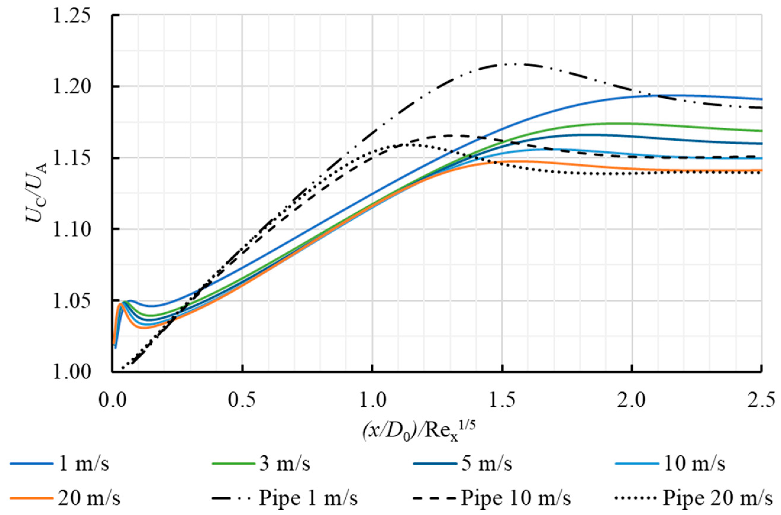 As the nominal velocity increases, the peak in the center velocity becomes less pronounced, and the velocity profiles tend to flatten more quickly. This trend can be explained by turbulence intensification with increasing Re. At lower nominal velocities (e.g., 0.05–0.2 m/s), viscous effects dominate, and the velocity profiles show a more parabolic distribution, which is observed from a less uniform distribution of a center velocity. In contrast, the flow stabilizes faster for higher velocities (5–10 m/s), and the center velocity remains nearly constant after the initial adjustment region of x/D0 = 0.