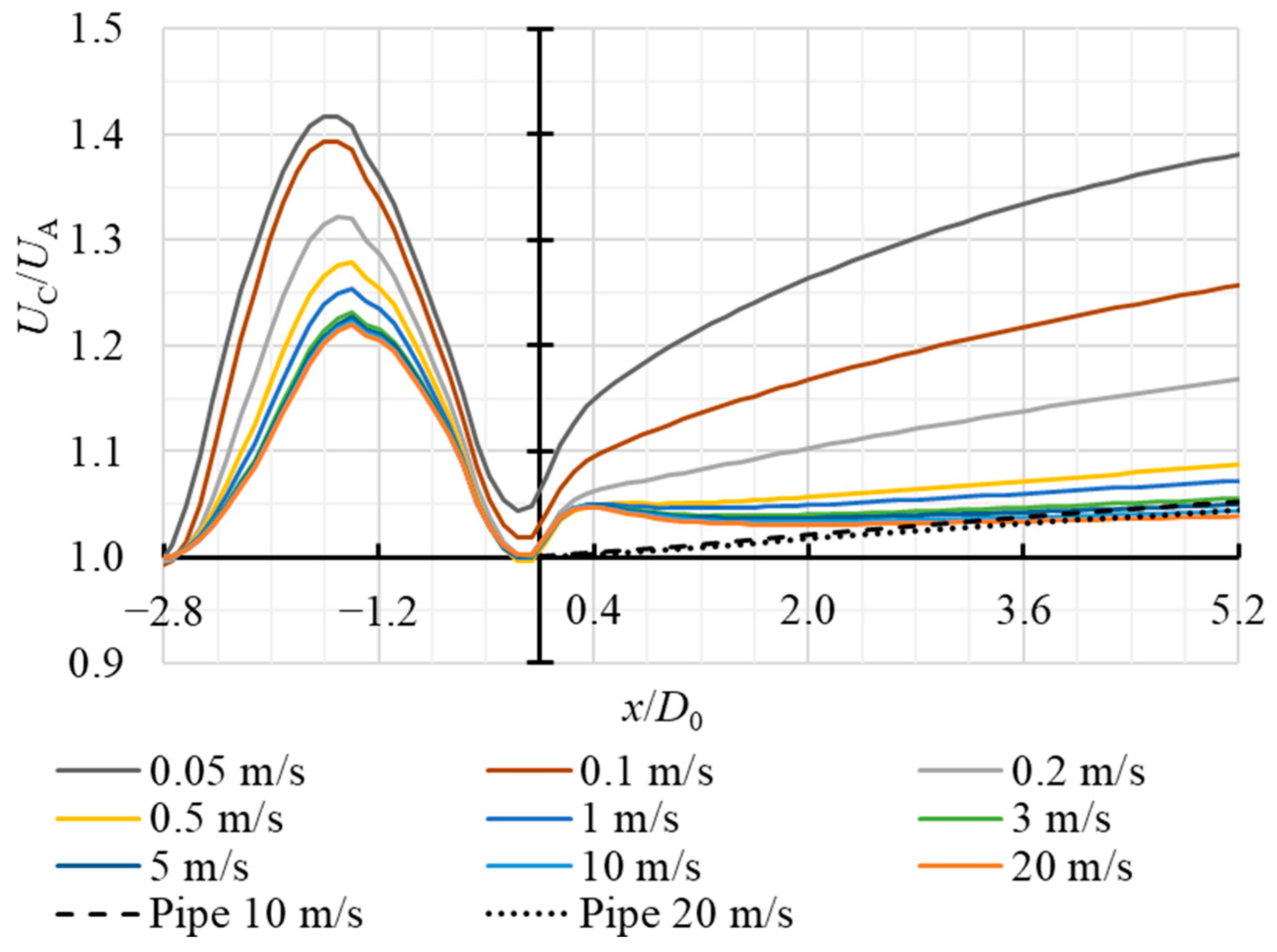 All nominal velocity cases show a similar distribution mechanism. The acceleration region is observed within the converging section, where the flow is compressed, and the velocity at the center increases. This velocity peak is observed in the x/D0 range from −1.4 to 1.6, which is caused by the combined effects of geometric contraction and the acceleration caused by the pressure gradient. Afterwards, the velocity rapidly decreases as the flow adjusts to the uniform diameter section of the pipe.