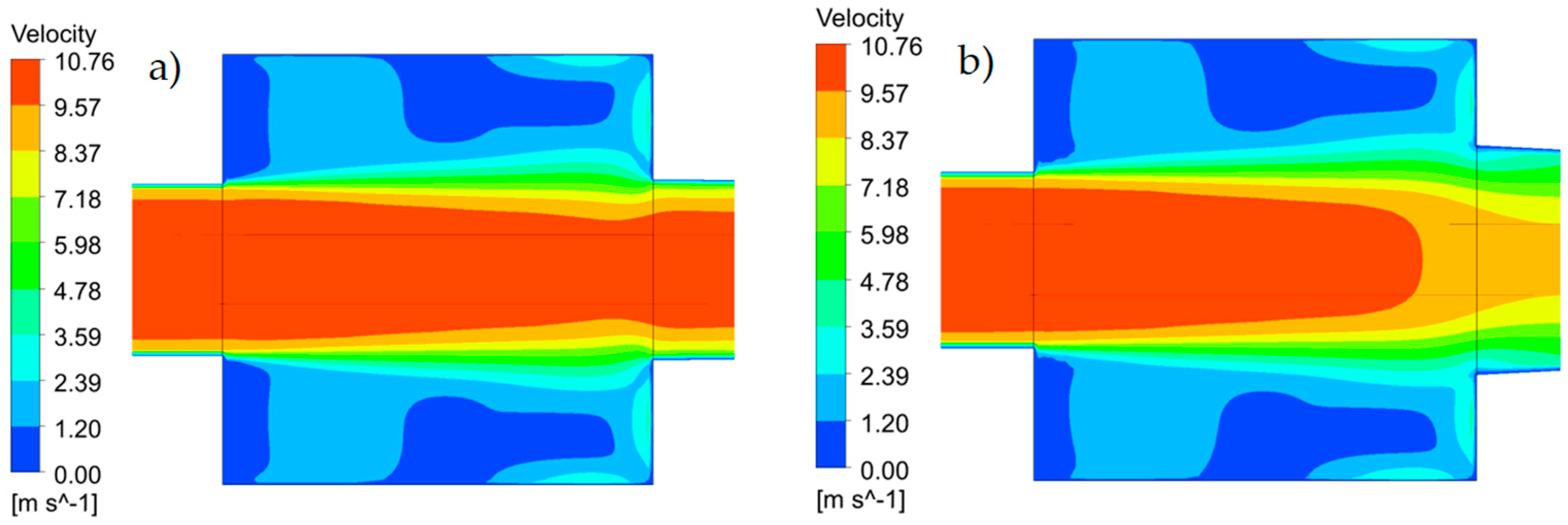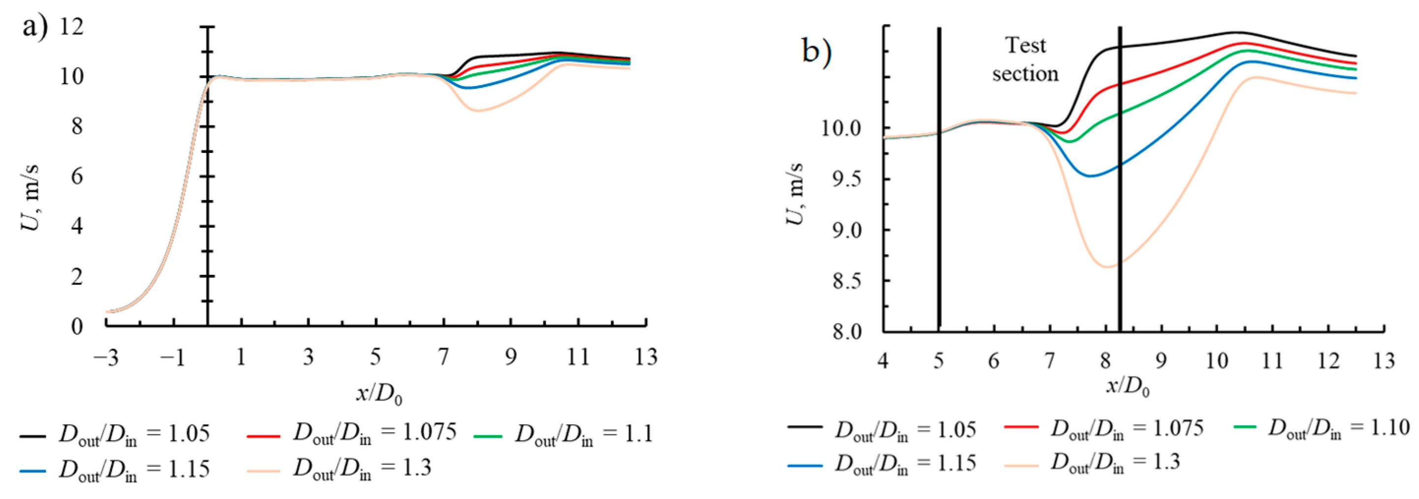 Figure 9, the presented velocity contours at two different expansion ratios reveal the flow structure inside the test section and demonstrate the influence of the outlet diameter on the recirculation zones, flow uniformity, and centerline velocity distribution.