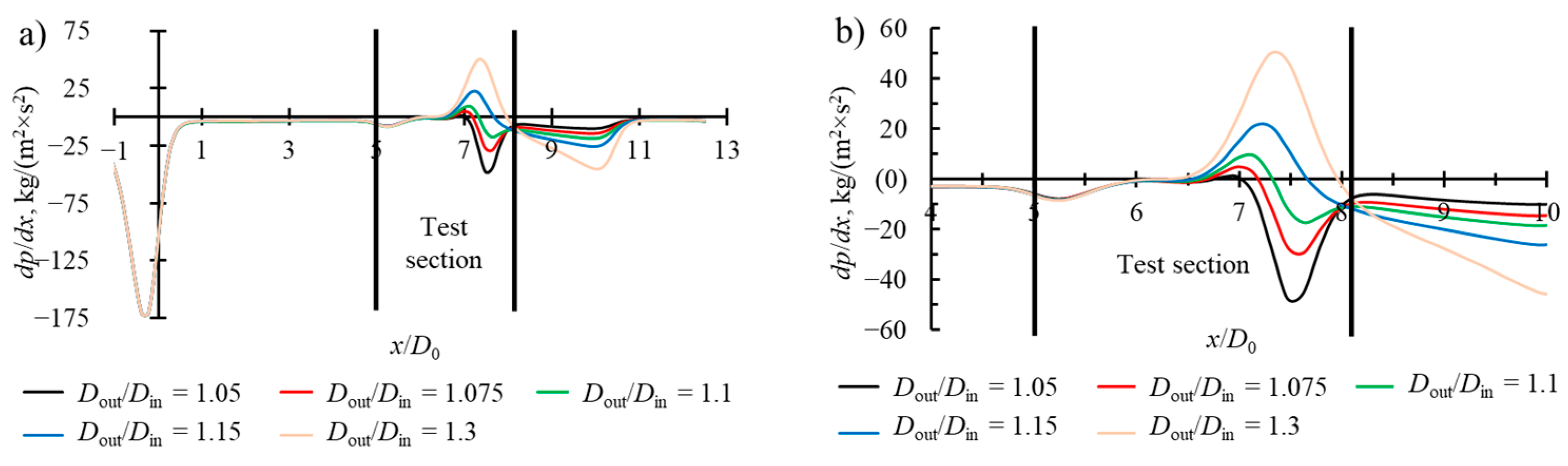 D0) pipe section. This is an effect of the CN, which was discussed in the previous section of this work. A characteristic adverse pressure gradient and velocity increase are observed in all cases immediately after flow enters the test section at