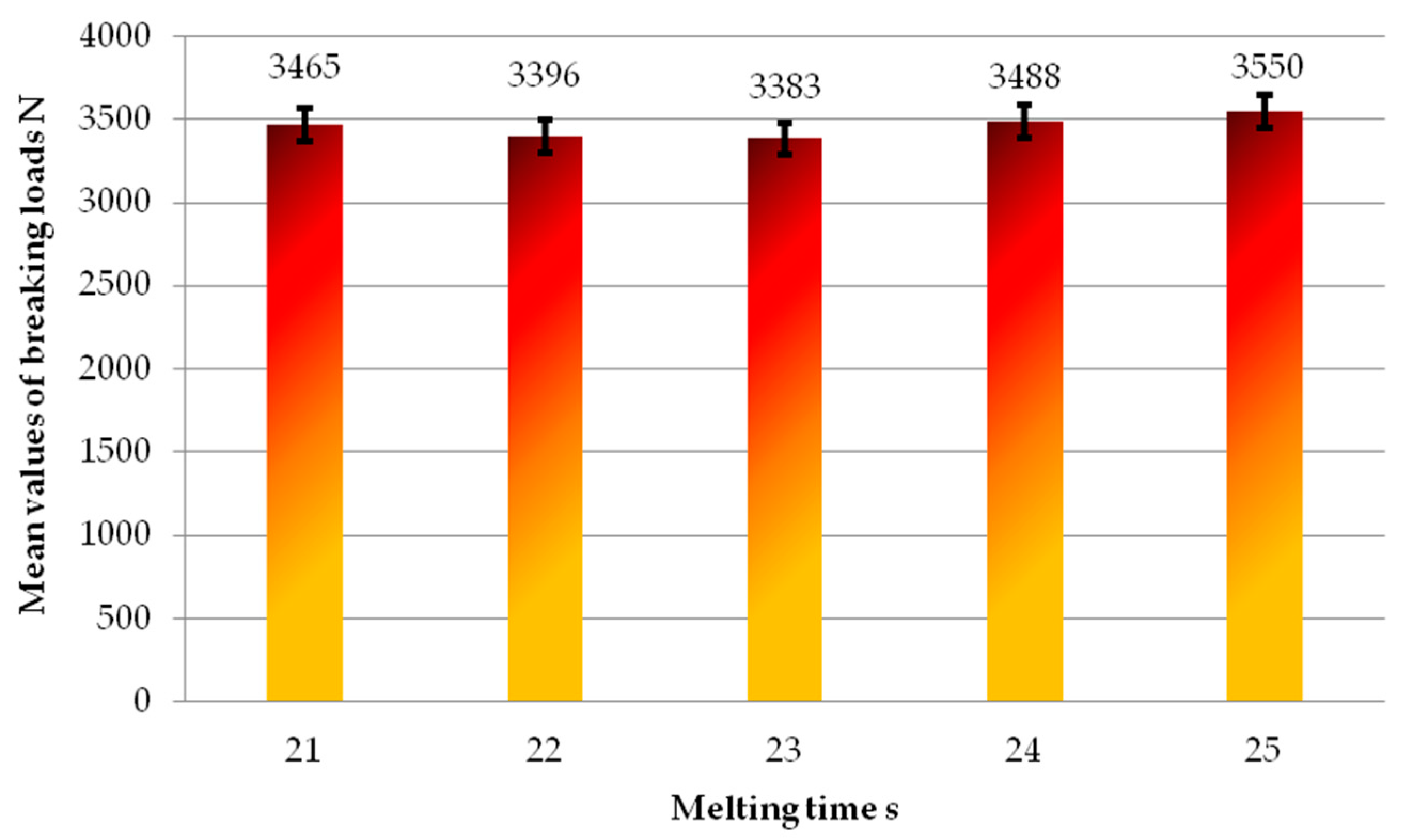 3.1. Comparison of the Average Failure Loads of Sets of Specimens, in the Context of a Given Melting Time, for a Milling Depth of 1 mm for the Glass Fibre-Reinforced Composite