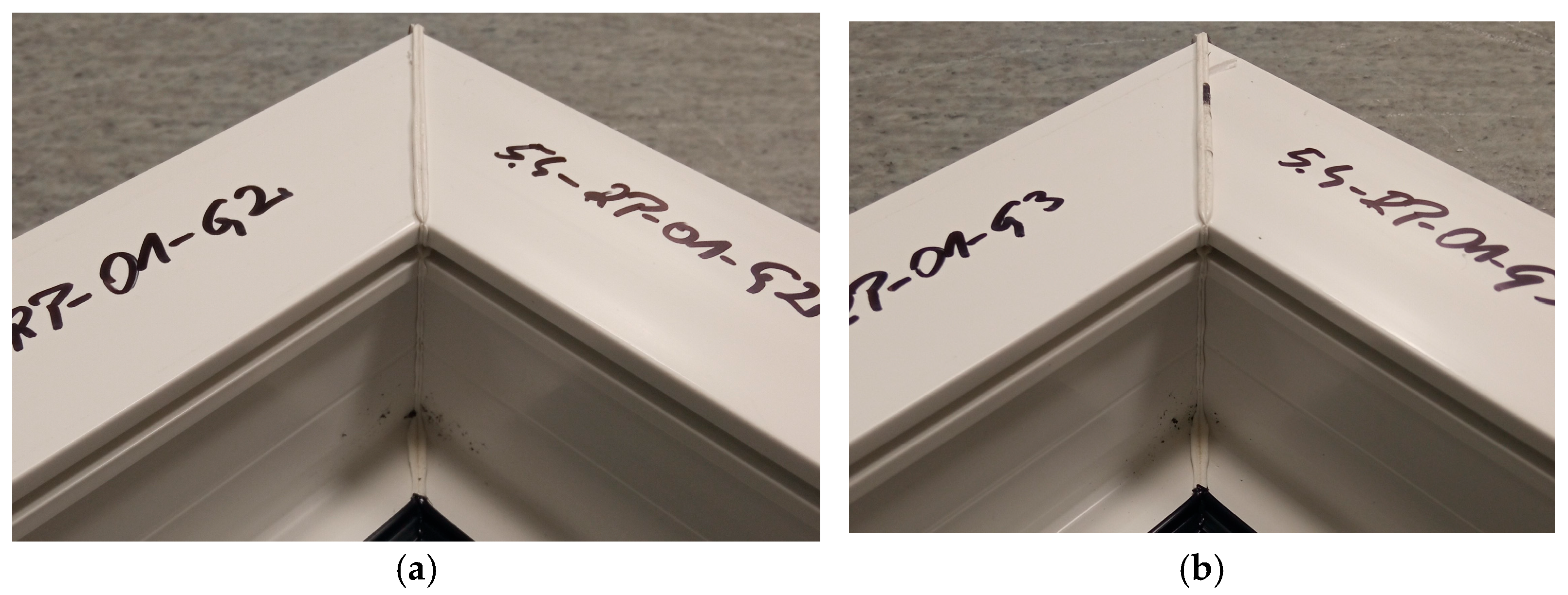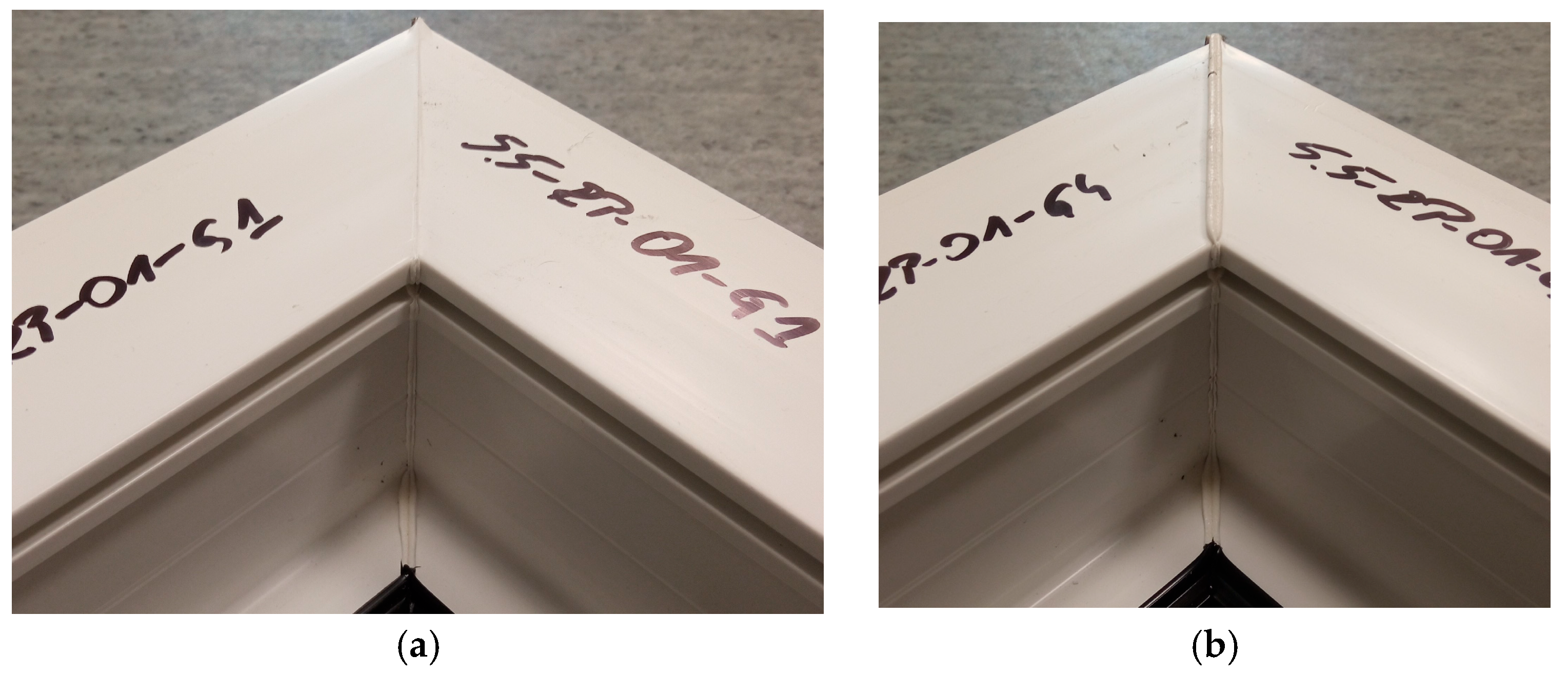 - Postawa, P.; Stachowiak, T.; Gnatowski, A. Strength Analysis of Welded Corners of PVC Window Profiles. IOP Conf. Ser. Mater. Sci. Eng. 2017, 225, 012003. [Google Scholar] [CrossRef]