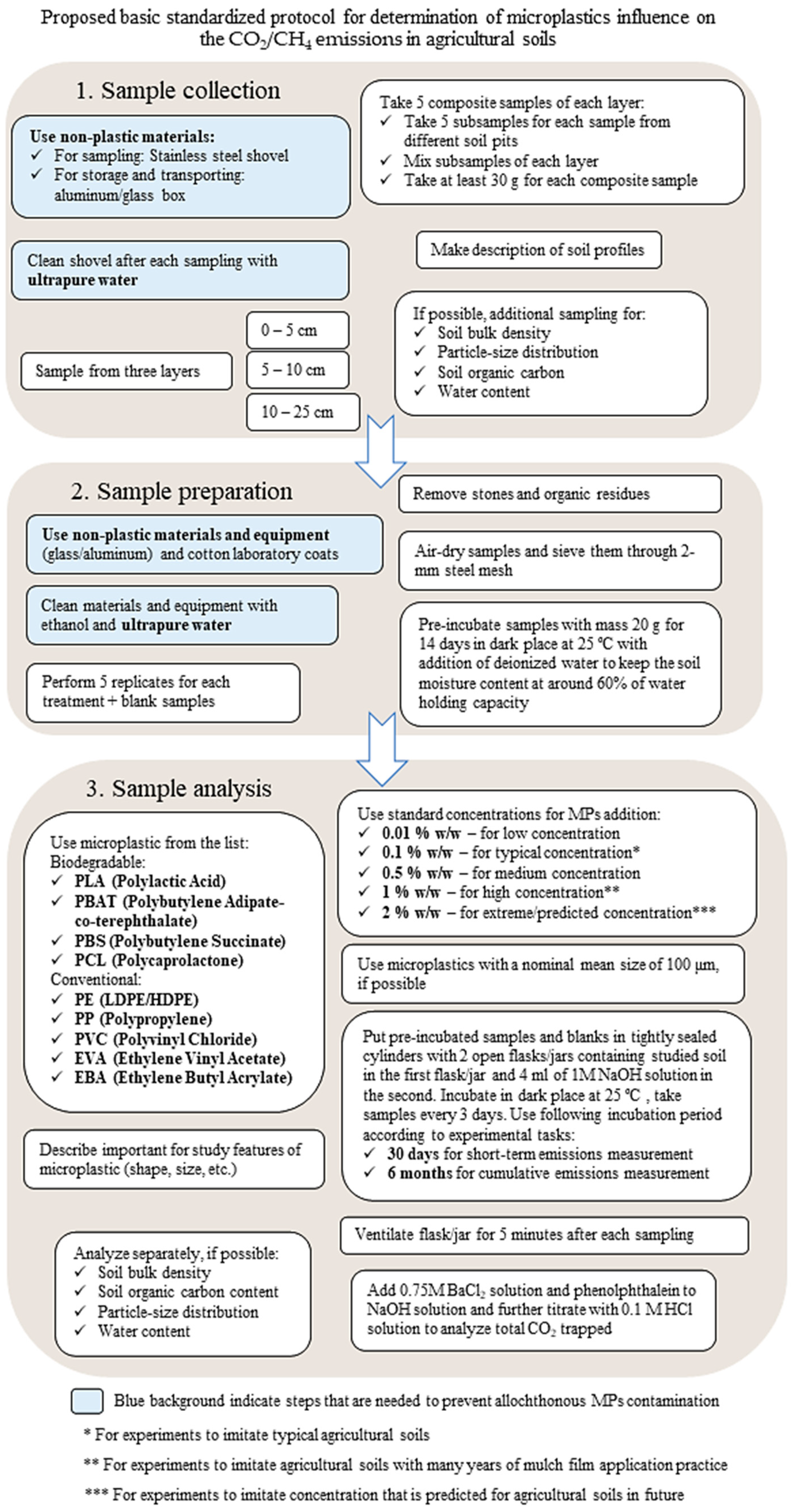 Having identified the best practices, taking into account the availability, repeatability in different laboratories, and accuracy of the methods, as well as recreating the experiments in the natural conditions characteristic of agricultural soil as much as possible in (including temperature, moisture content, types, and concentrations of MPs), we developed a preliminary proposal for standardizing the protocol for the determination of microplastics’ influence on the CO2 and/or CH4 emissions in agricultural soils.
