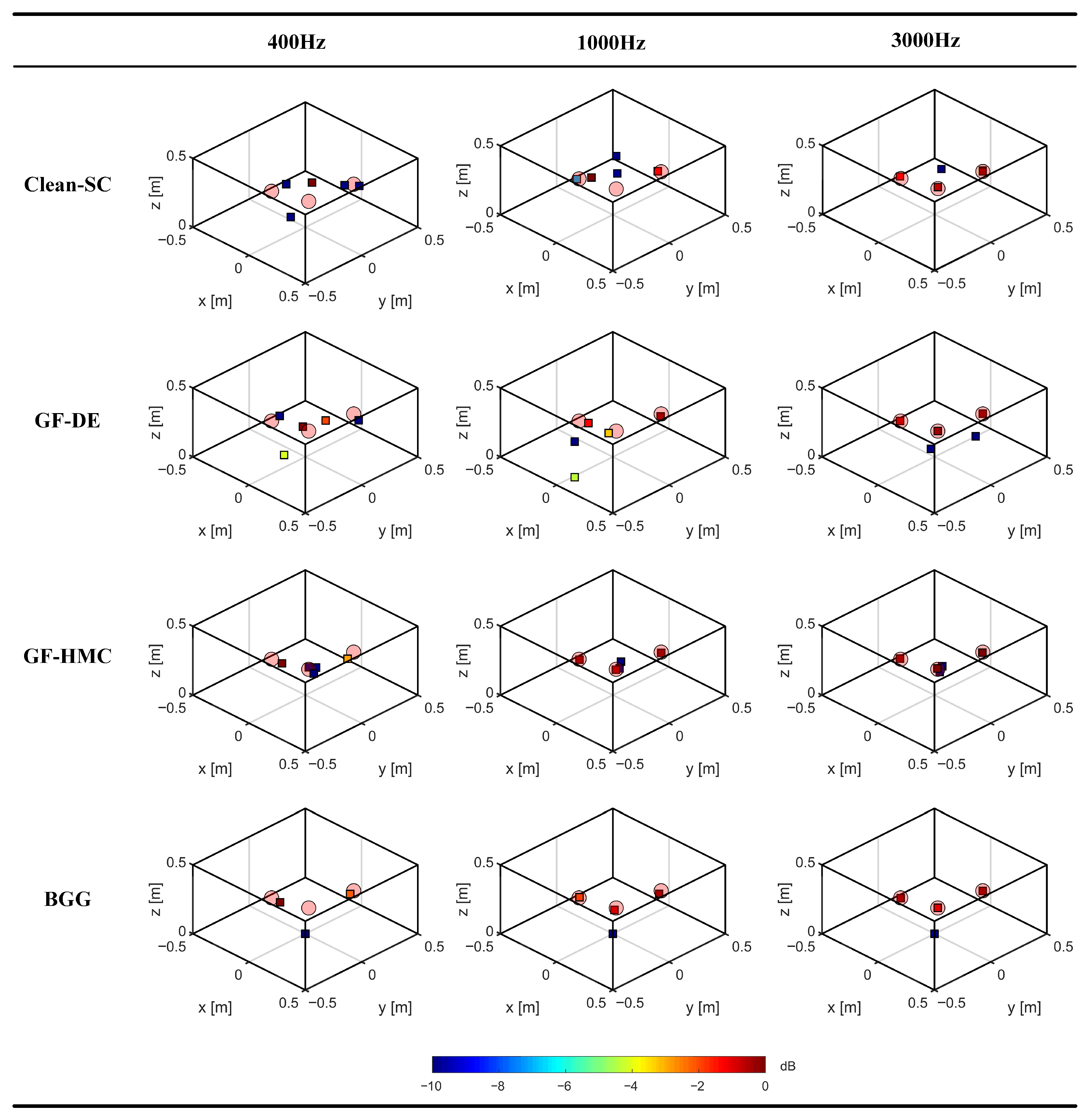 - Chardon, G. Gridless Covariance Matrix Fitting Methods for Three Dimensional Acoustical Source Localization. J. Sound Vib. 2023, 551, 117608. [Google Scholar] [CrossRef]