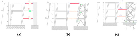 Seismic retrofitting systems with external structures: dissipative devices activated (a) by absolute floor displacement and (b) by interstory drift, (c) System with a dissipative tower.