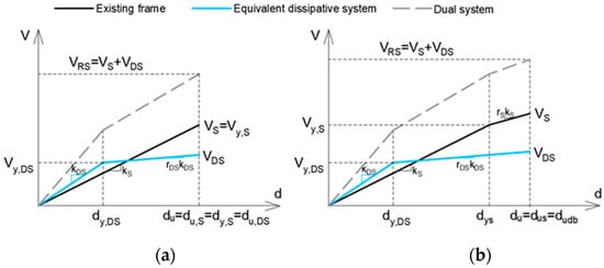 The hysteretic behaviors of both the dissipative system and existing framed structure are described by bilinear models []; therefore, the corresponding viscous damping of the equivalent damper can be evaluated as follows: