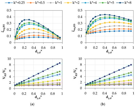 Equivalent viscous damping and stiffness increment of of the dual system as a function of the dimensionless yielding displacement with varying ductility (frame in the plastic field) for the fixed values of and : (a) (); (b) ().