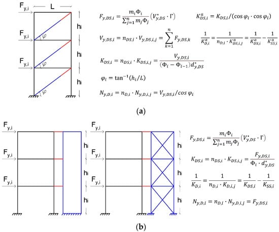 Di Cesare and Ponzo [] focused on steel hysteretic brace systems and a procedure intended to control the maximum interstory drifts by regularizing the stiffness and strength along the height of a braced building according to the regularity criteria provided by seismic codes [,]. This method has been applied in several recent publications [].
