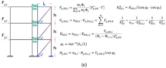 where and represent the ductility demand and stiffness variation after yielding of the dampers (index DS) and structure (S), respectively, and c is the damping modification factor. Equation (2) is analogous to Equation (1), but the concept of effective viscous damping using a damping modification factor c is introduced for cyclic degradation. ATC-40 [] assumes a value of 1 for structures with high dissipative capacity (large and large hysteresis cycles), 2/3 for poor hysteretic behavior (severely pinched) RC structures, and 1/3 for structures with low dissipative capacity (hysteresis cycles with high pinching and substantial area reduction).