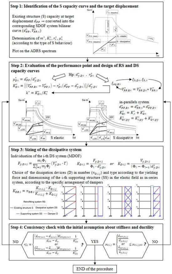 In this section, a displacement-based design framework applicable to structures in general, but in particular to frame buildings equipped with metallic hysteretic dampers, is presented. The iterative is based on the capacity spectrum method: first, the capacity curve of the existing structure is determined via nonlinear static analysis (NLSA), and then an iterative procedure allows the design of the capacity curve of the dissipative system, valid for treating both external dissipative systems and the conventional internal arrangement of dampers as dissipative braces.