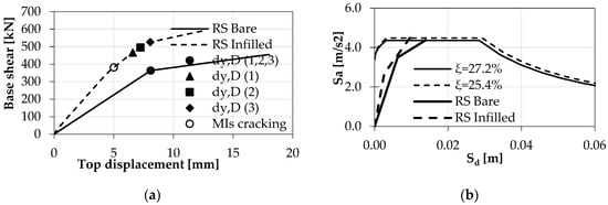 The performance base shear of the equivalent retrofitted system (RS), , also depends on the effective damping ratio, which is initially unknown. Consequently, by means of iteration, it is necessary to evaluate the equivalent viscous damping of the parallel system, , through the linear expression [] already introduced and rewritten for the case of the target point as follows: