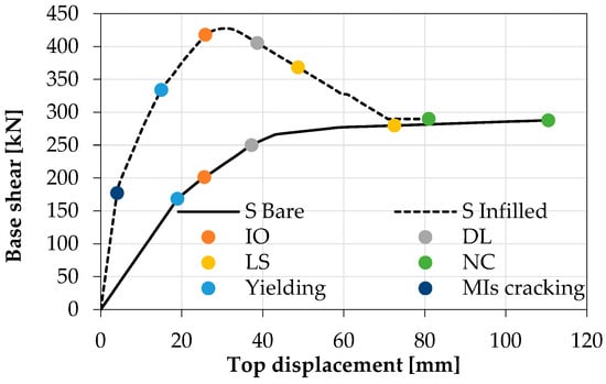 By setting the ultimate displacement of the as-built structure equal to the identified target displacement , the ductility is defined as , where is the yield displacement of the existing structure. If the structure remains in the elastic field .